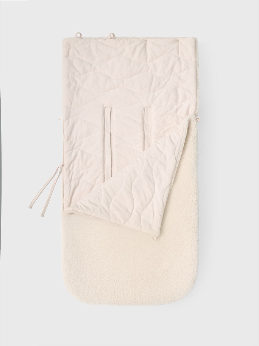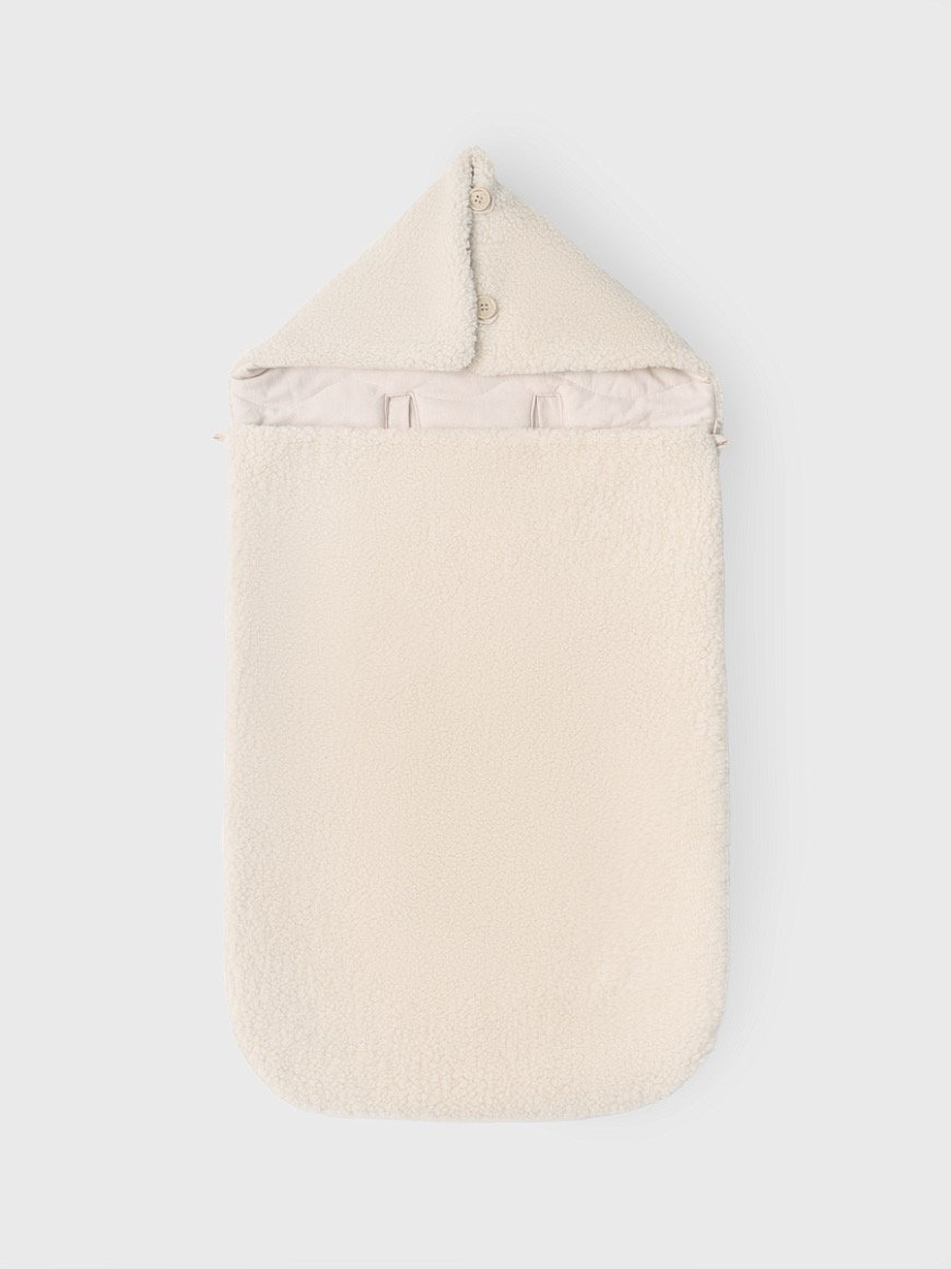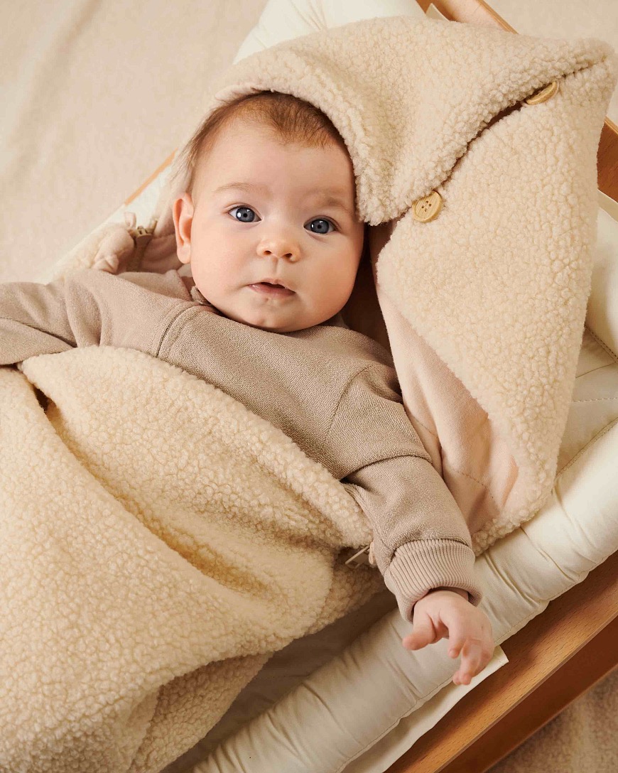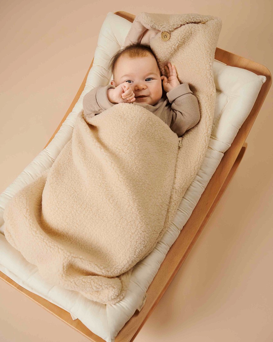 Верх в форме капюшона и молнии по бокам можно расстегнуть, превратив изделие в одеяло, а дополнительные шнурочки помогут зафиксировать отогнутую часть.