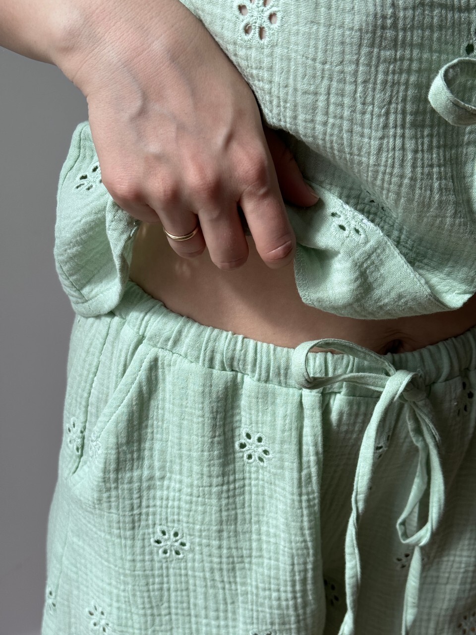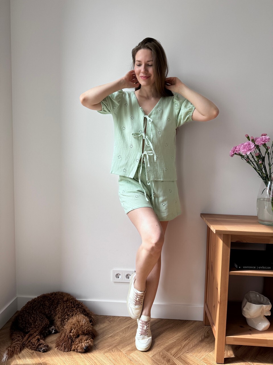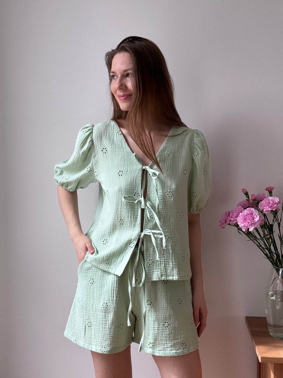 Костюм IVA DESIGN для дома из ажурного муслина для дома и отдыха. Комфортные шорты и легкая блузка с завязками. Легкий доступ к груди – просто развяжите завязку. Носите комплект дома или в отпуске – идеально также надевать поверх купальника.