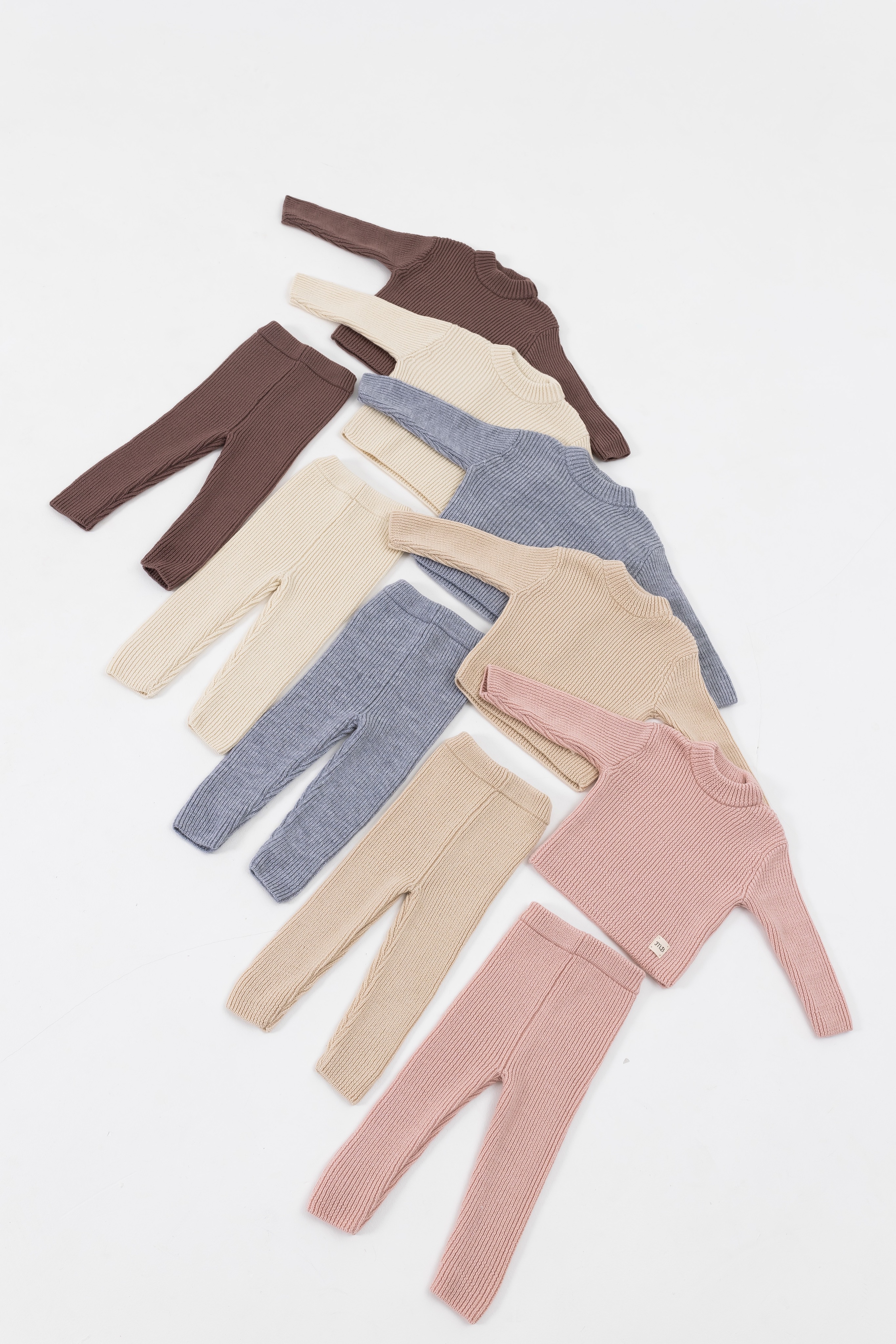 Джемпер с мягким круглым вырезом и штанишки — лосины с эластичным поясом с отверстие для регулировки поясной резинки. Модель классической вязки с приталенным силуэтом. Манжеты можно регулировать по мере роста малыша.