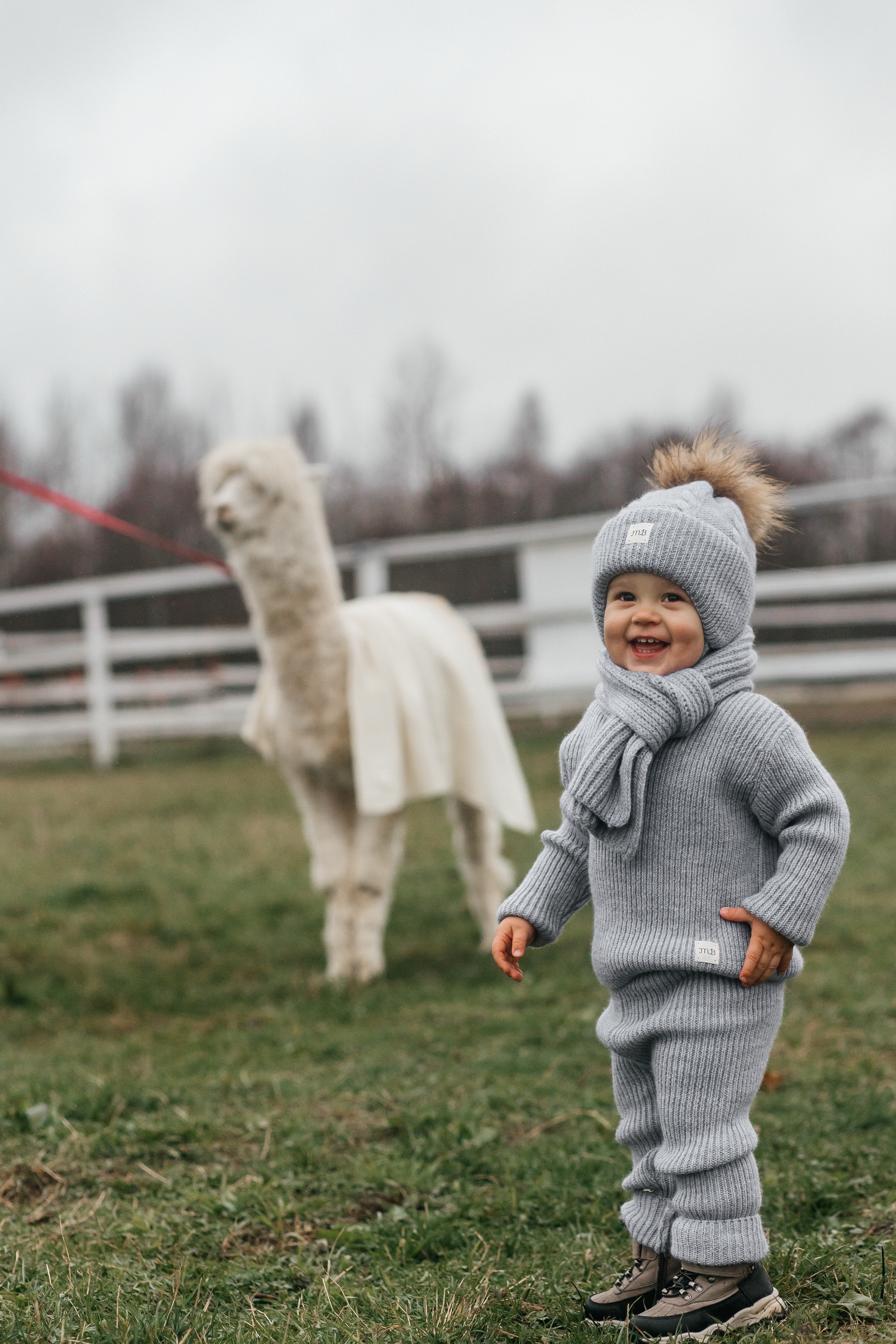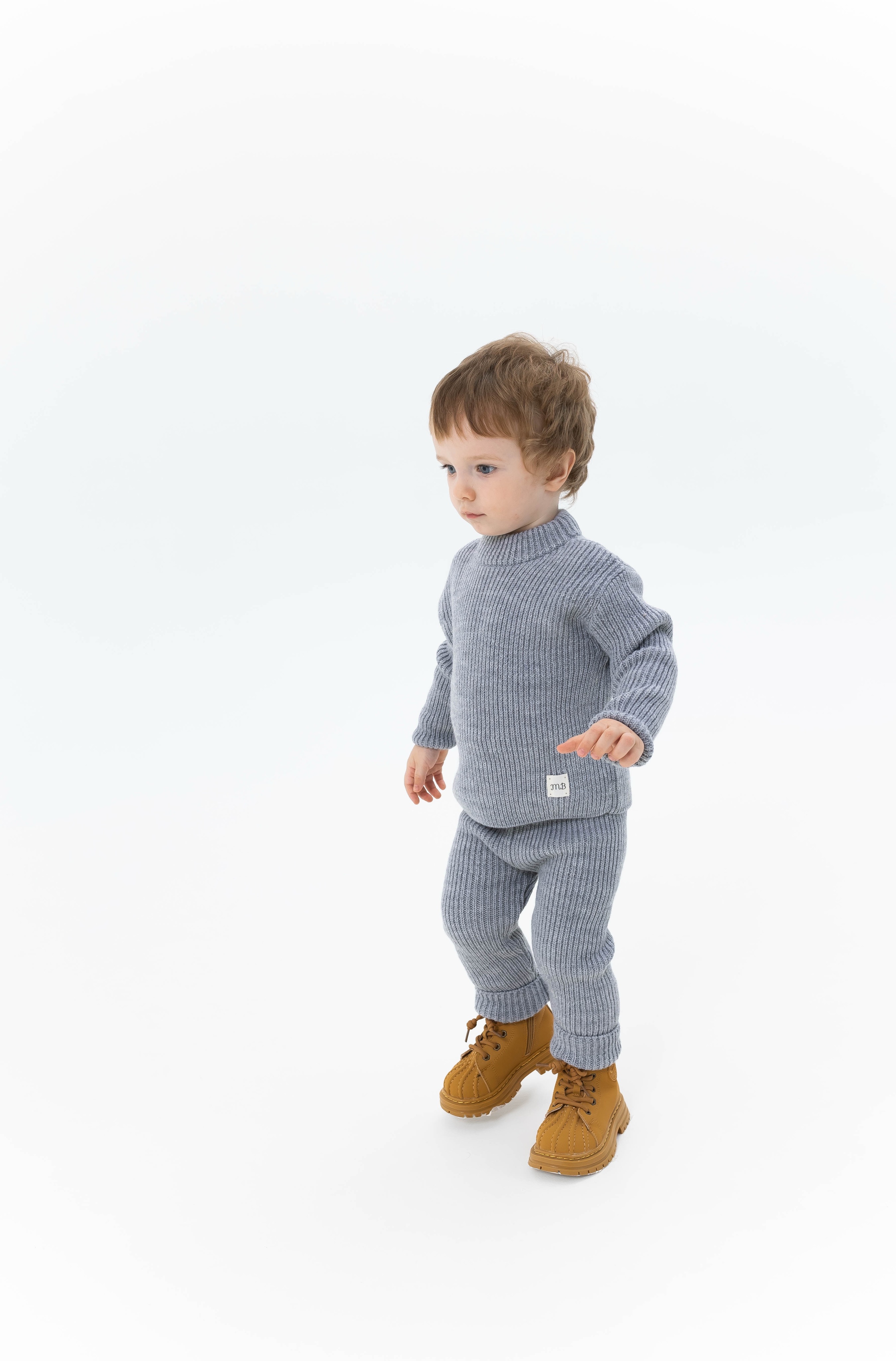 Джемпер с мягким круглым вырезом и штанишки — лосины с эластичным поясом с отверстие для регулировки поясной резинки. Модель классической вязки с приталенным силуэтом. Манжеты можно регулировать по мере роста малыша.