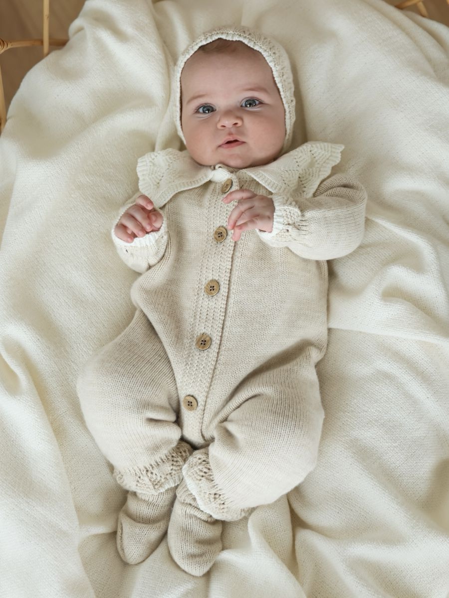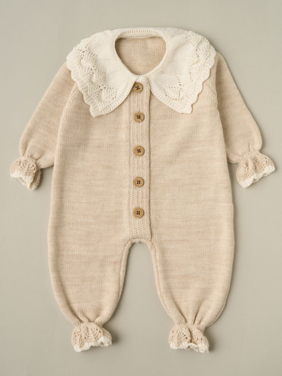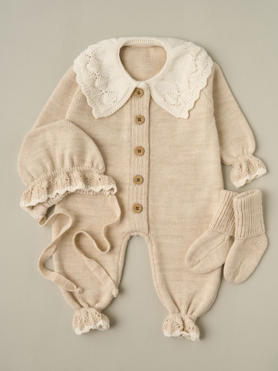 Вязаный комплект для девочки — очаровательный и практичный вариант для малышей. В набор входит комбинезон, шапочка и носочки. Изготовлен из мягкой пряжи (20% хлопок, 30% шерсть, 50% ПАН), которая отлично сохраняет тепло и обеспечивает комфорт. Декорирован деревянными пуговицами и кружевным воротничком, что придаёт образу нежность и изысканность.