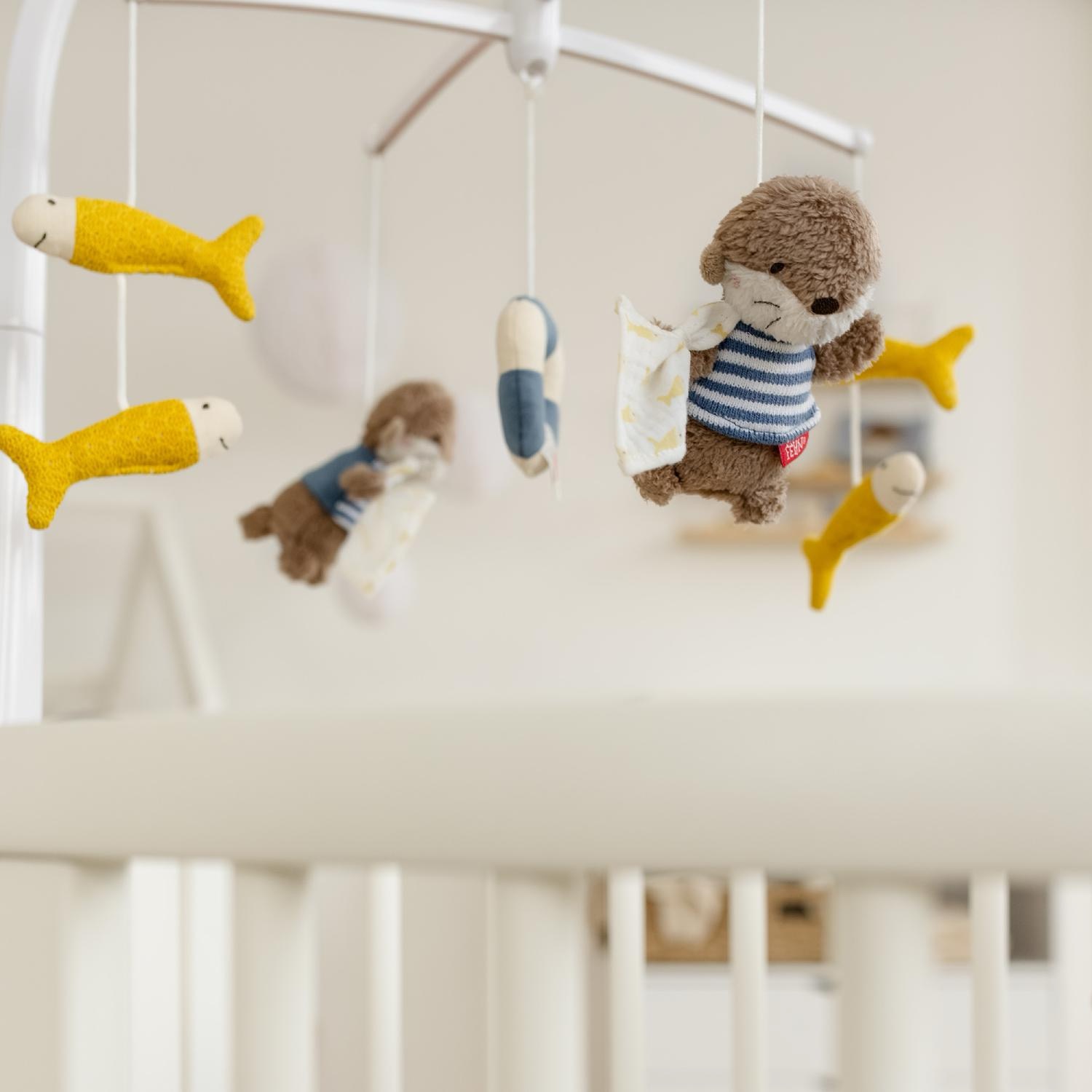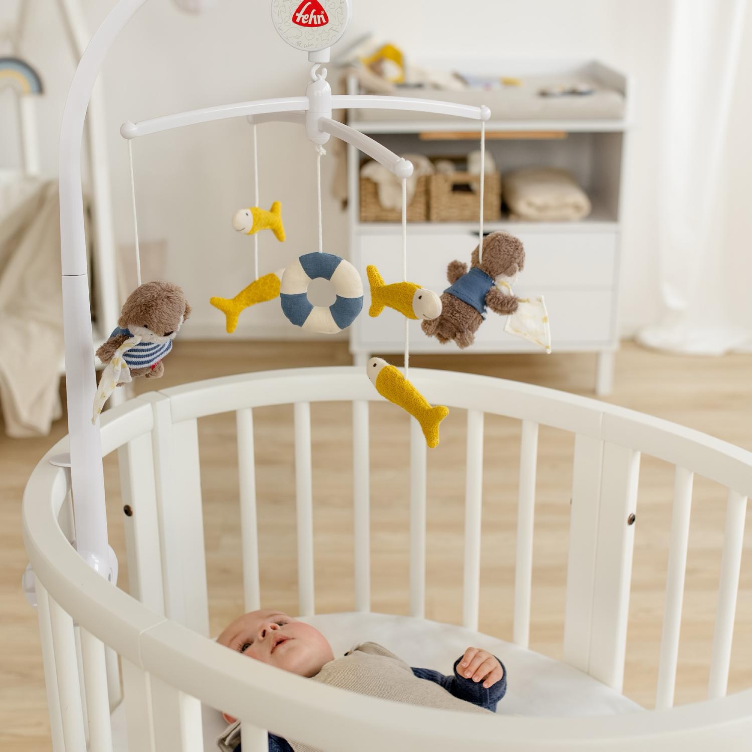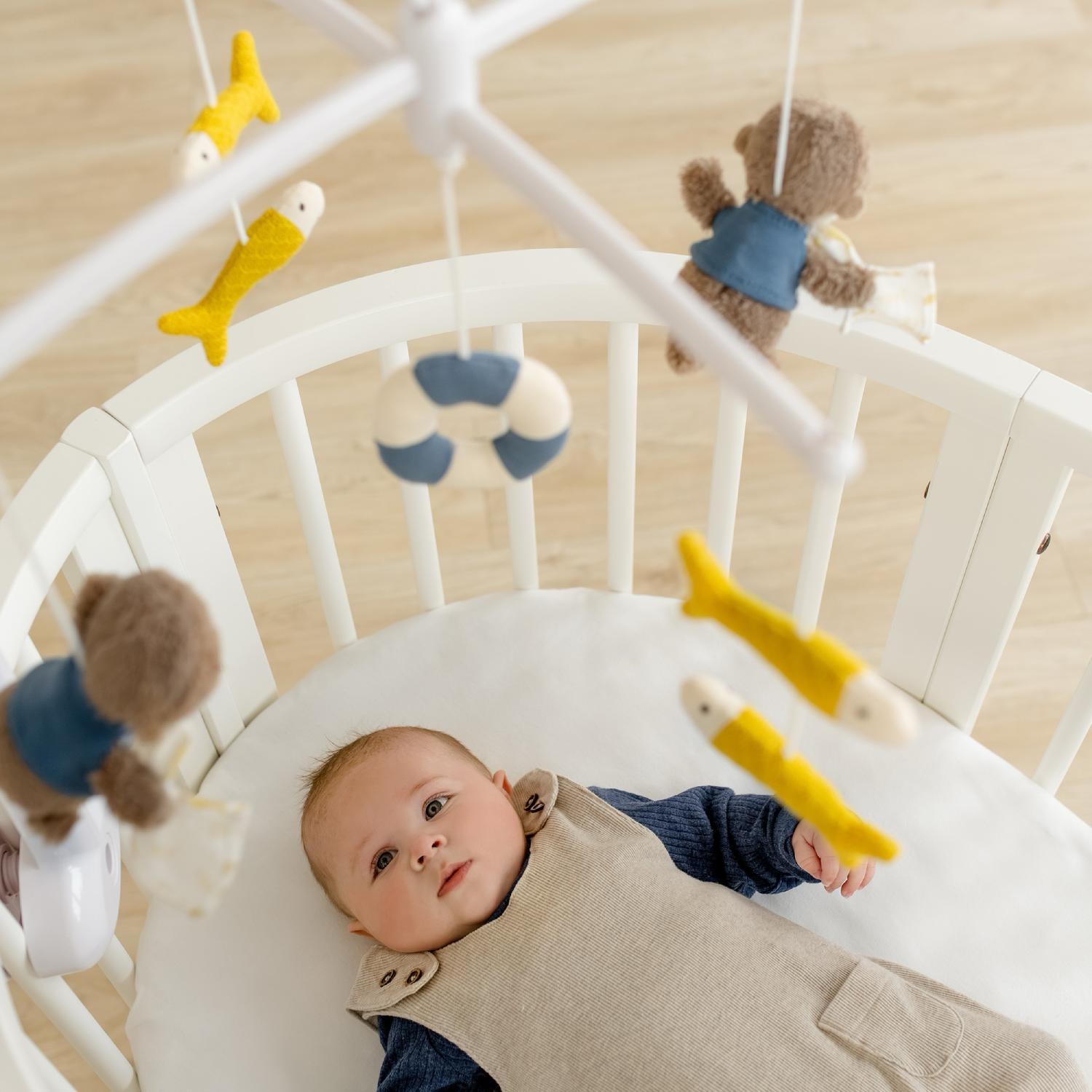Музыкальный мобиль для будущих мореплавателей – здесь игрушечные выдры, рыбки и даже мягкий спасательный круг кружатся под колыбельную Моцарта «Спи, мой принц». Время воспроизведения – около 4 минут. Мелодию можно выключить в любой момент одним нажатием на кнопку.