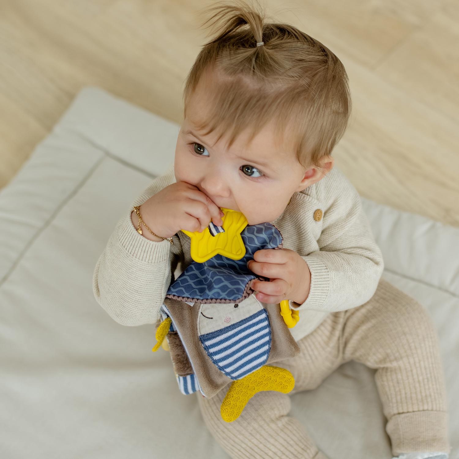 Мягкая игрушка-книжка с доброй мордашкой выдры. Интерактивные детали игрушки развивают основные навыки у малыша во время игр в дороге и дома.