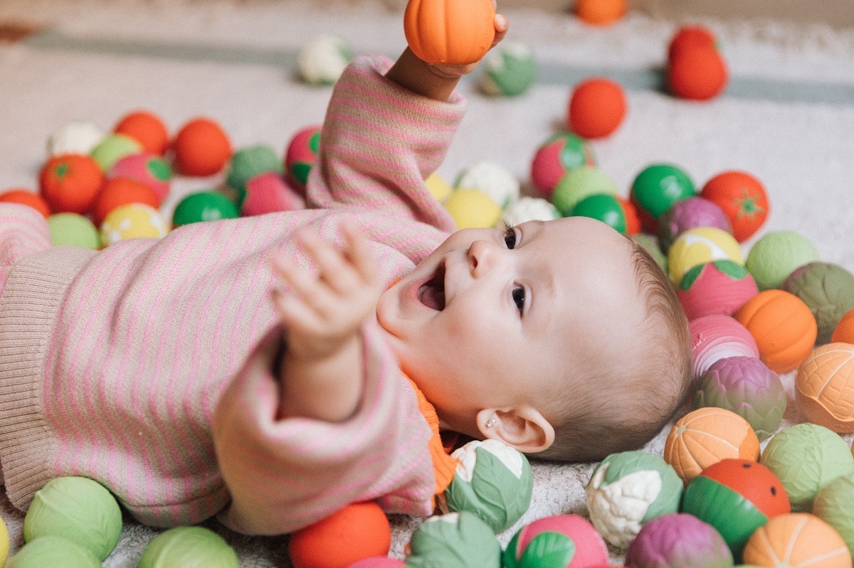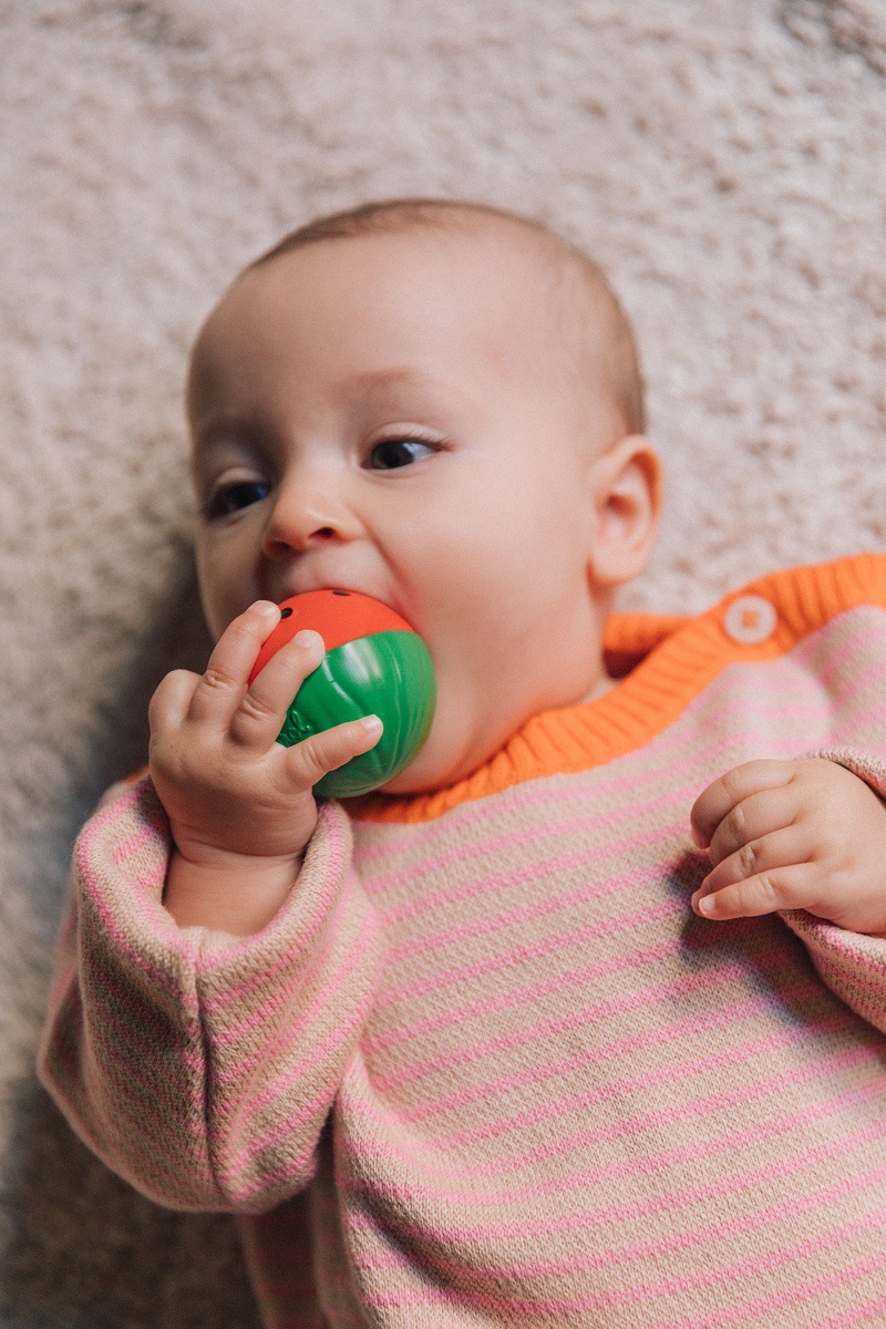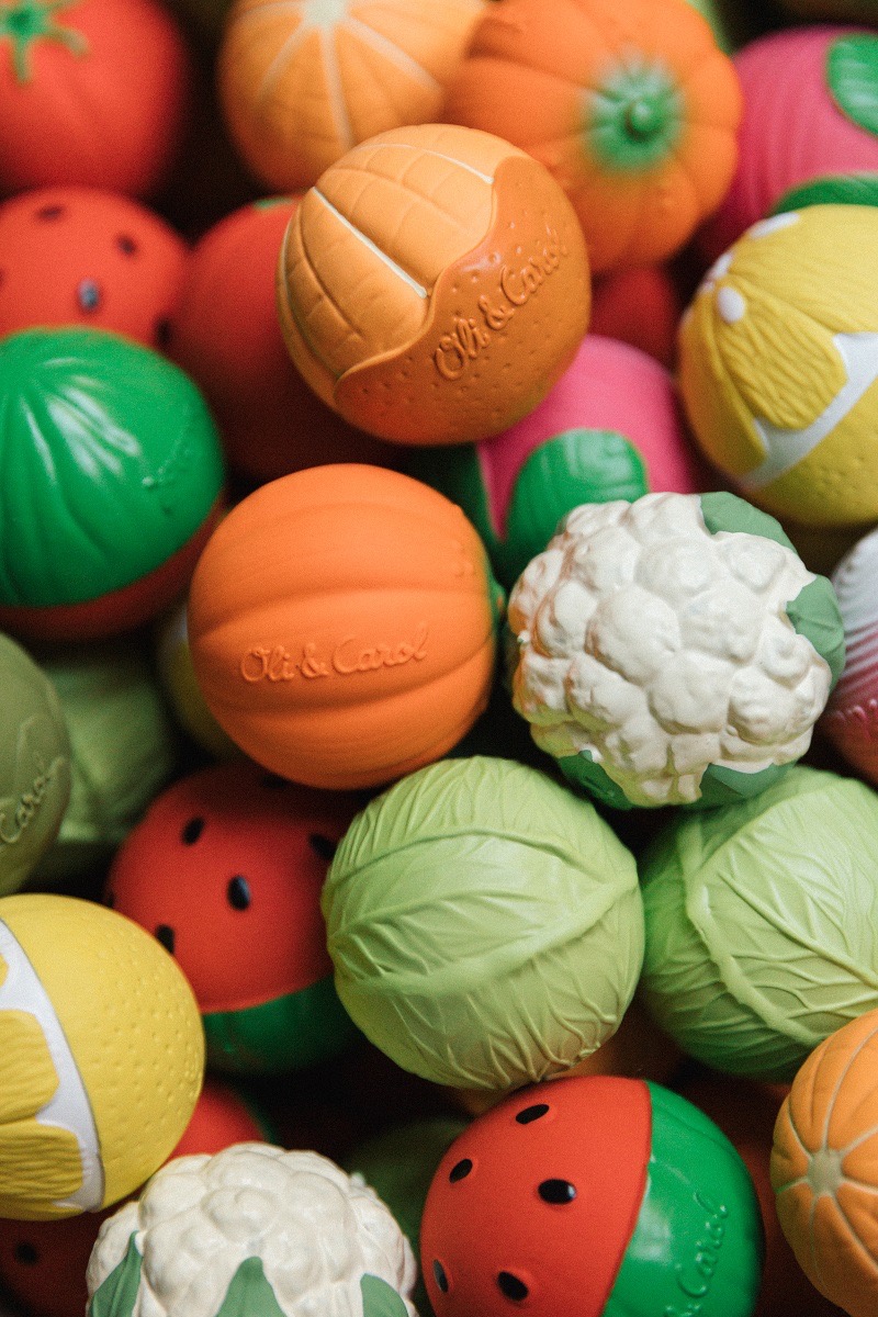Мячики Fruit Salad Baby Sensory Balls изготовлены из 100% натурального каучука и окрашены пищевыми красителями. Изделия Oli&Carol — без отверстий, а значит, это самые безопасные и гигиеничные игрушки для купания.