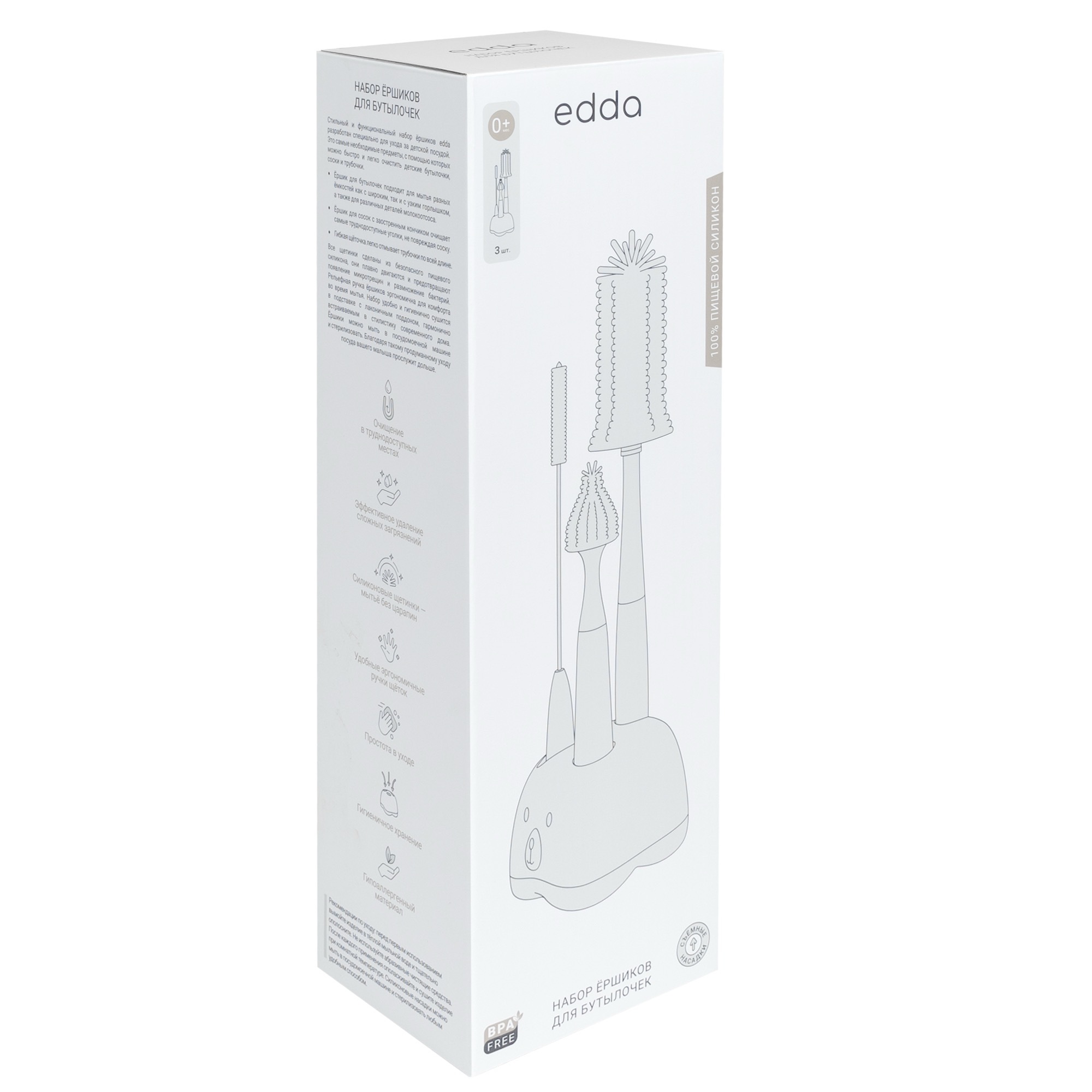 Стильный и функциональный набор ёршиков edda разработан специально для ухода за детской посудой. Это самые необходимые предметы, с помощью которых можно быстро и легко очистить детские бутылочки, соски и трубочки.