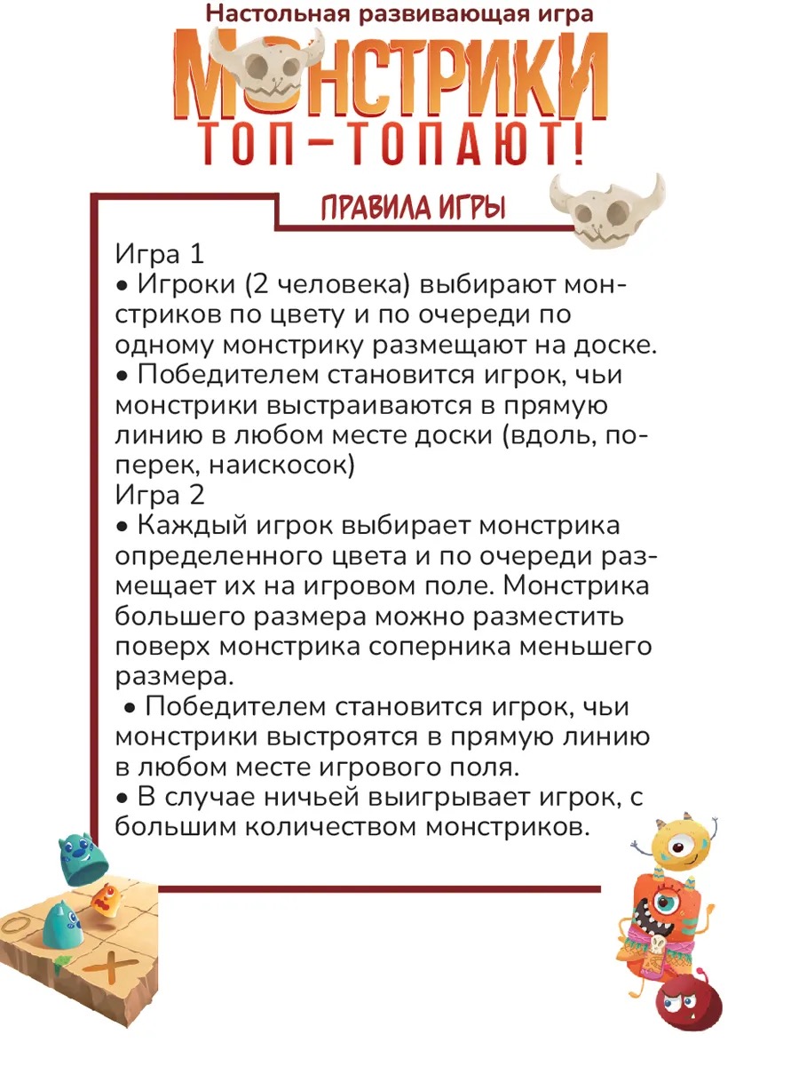 В комплект входит: доска-головоломка, 10 фигурок монстров, буклет, инструкция.
