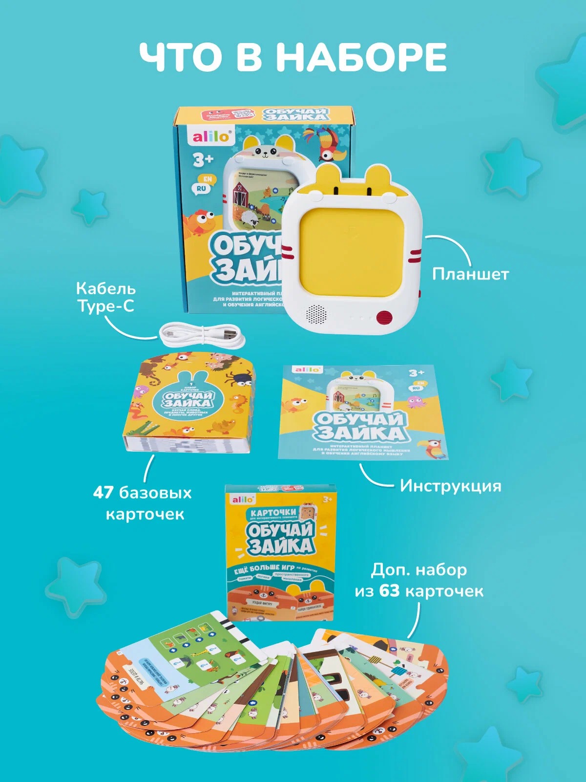 Обучай-Зайка alilo – детский интерактивный развивающий планшет с дополнительным набором карточек. Специально для любознательных малышей от 3 лет!