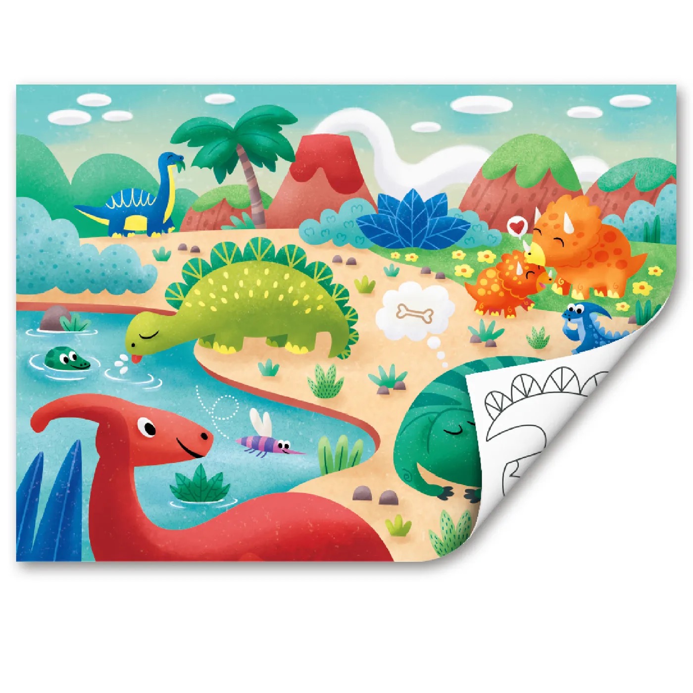 Подходит для раскрашивания акварелью, цветными карандашами, красками, фломастерами и даже пальчиками. Соберите с ребёнком яркую картинку с динозаврами, затем переверните её, и вы обнаружите новую картинку с контурами для раскрашивания. Ваш малыш узнает, как выглядят динозавры и сможет сам выбрать цвета для героев на картинке.