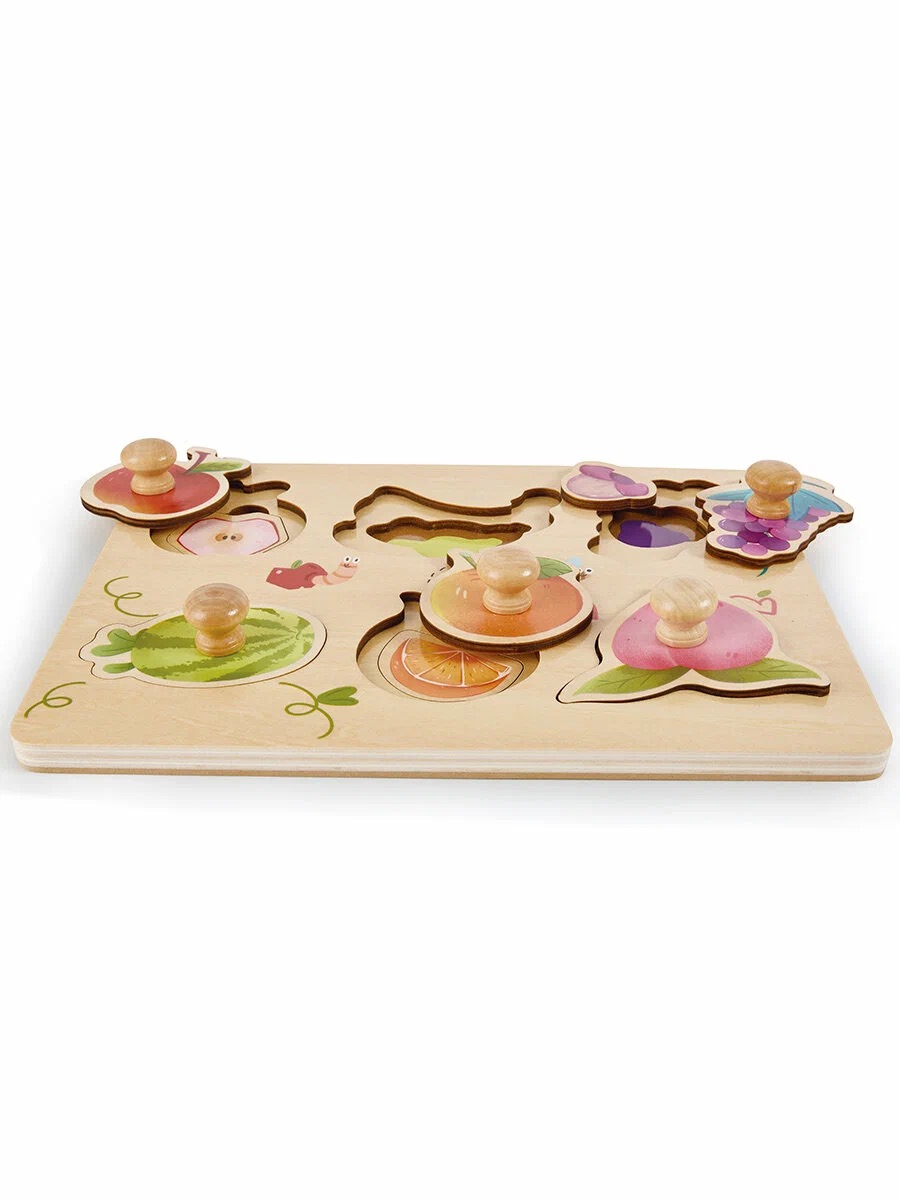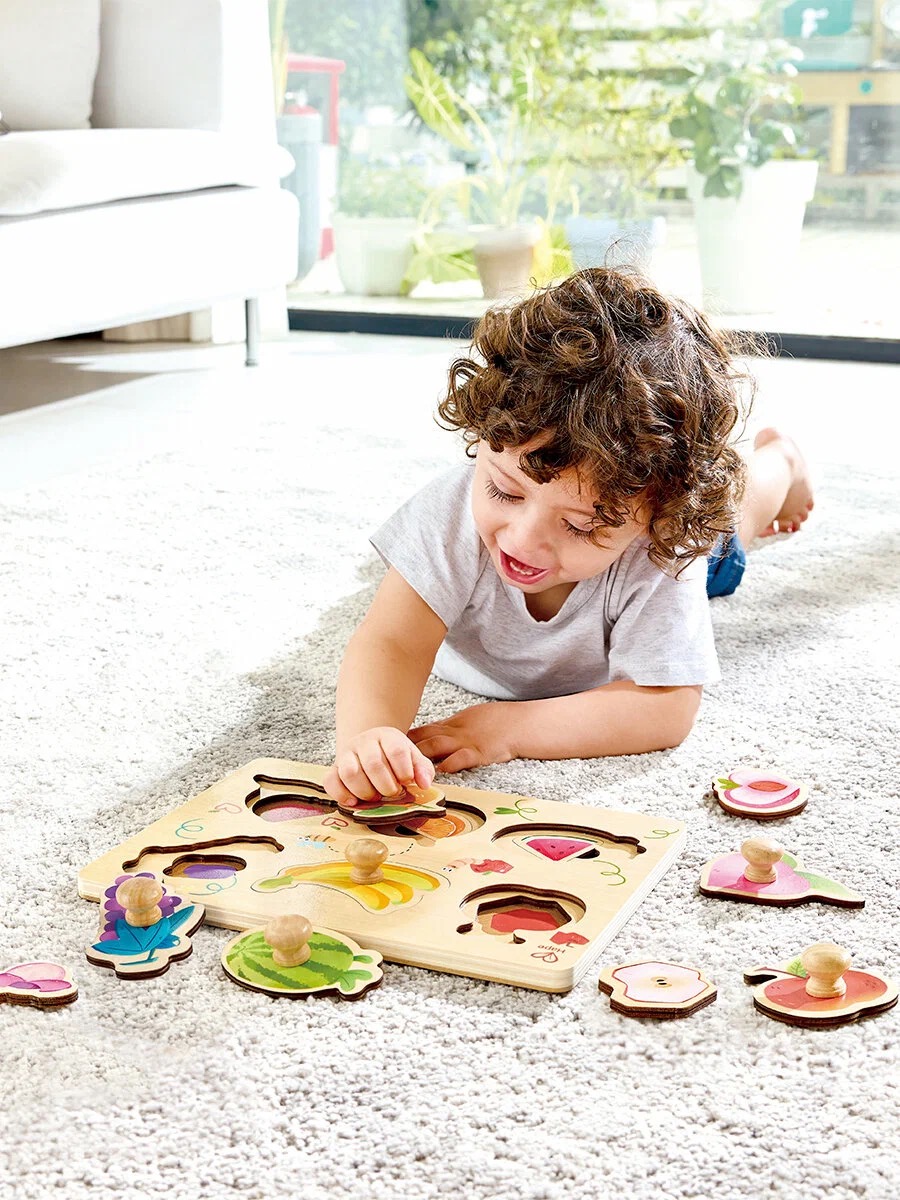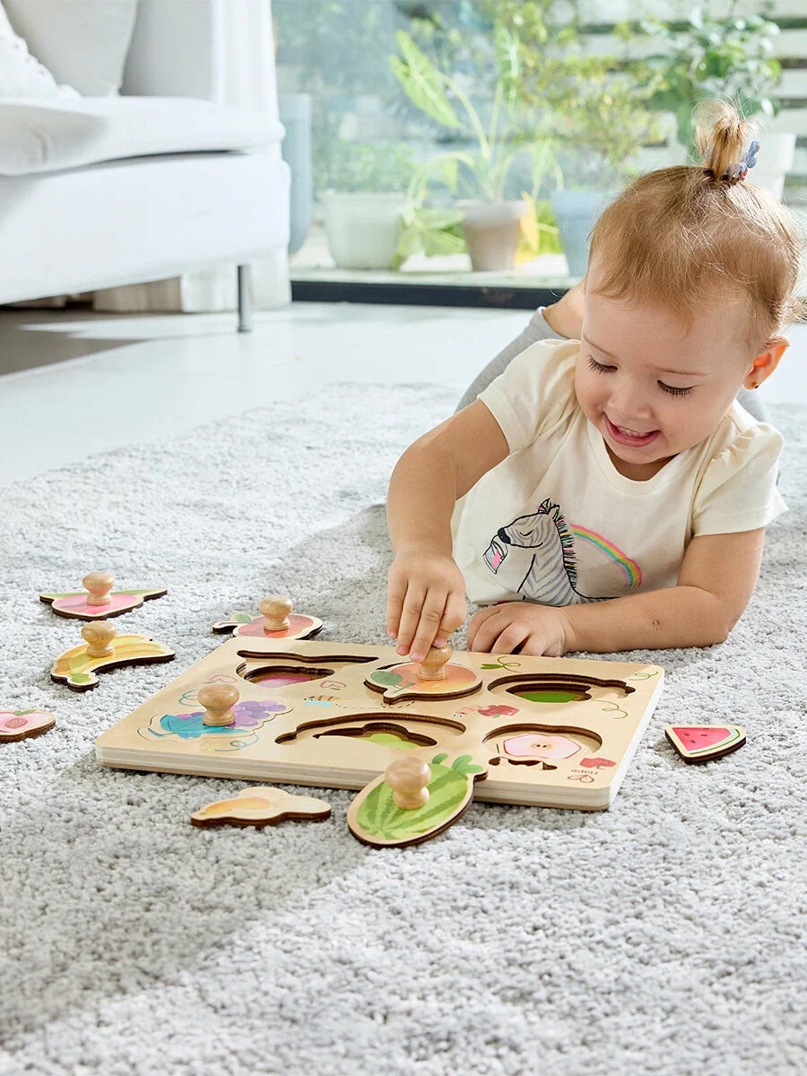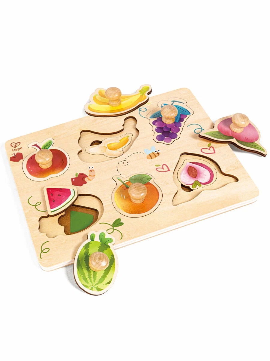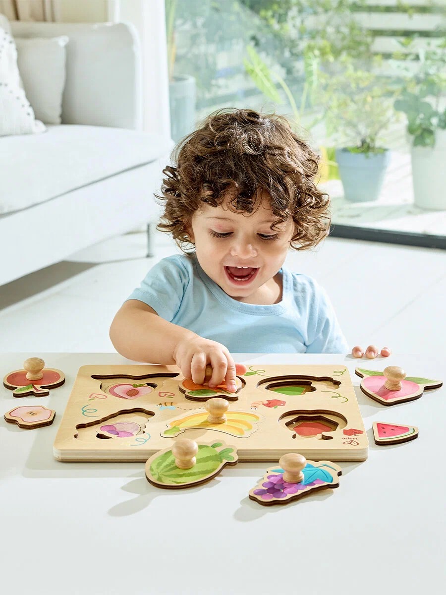 Изучайте внешний вид и формы фруктов и ягод с помощью этого пазла. Дети могут выбирать блоки по форме и цвету и вставлять их в специальные углубления.