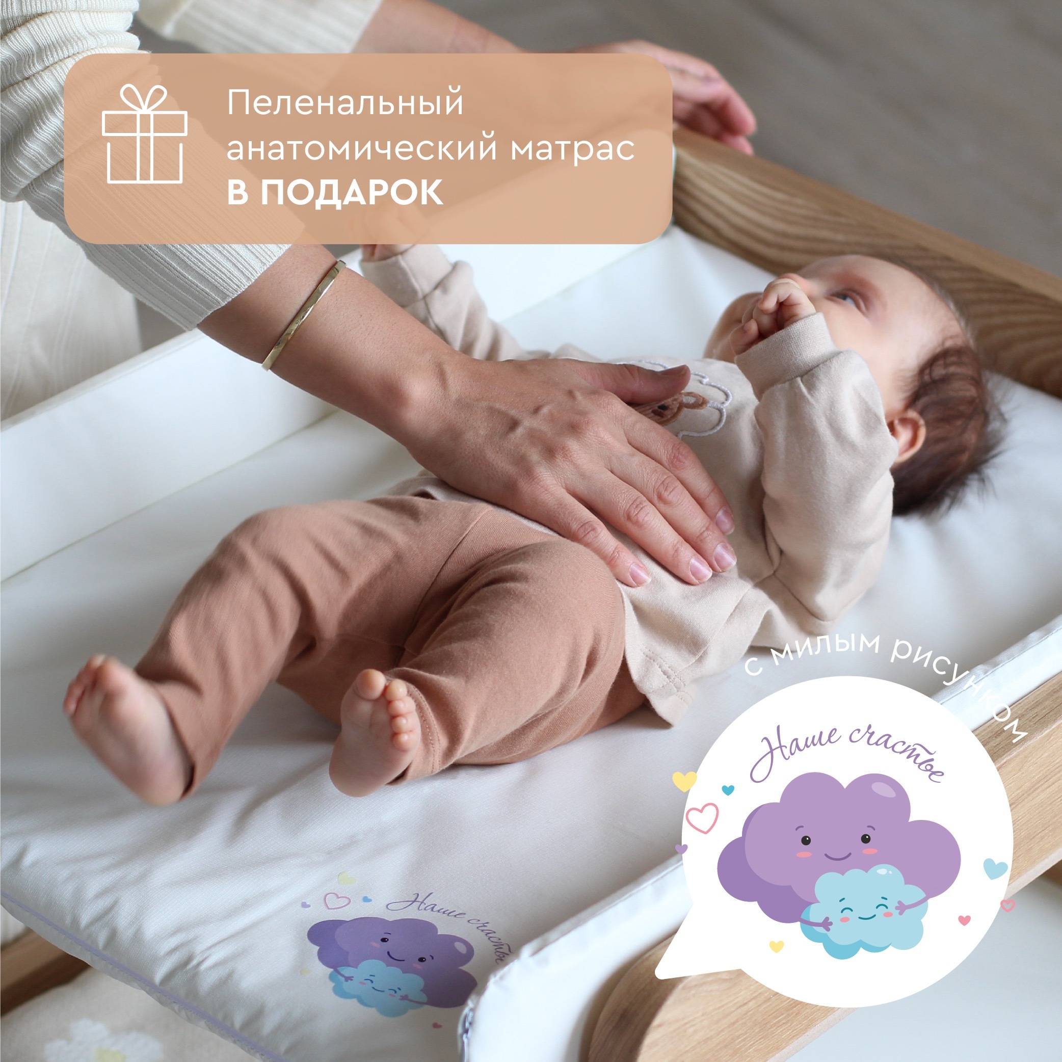 В комплекте с пеленальным столиком поставляется анатомический матрас для пеленания от компании «Фабрика облаков». Вам не нужно искать подходящий вариант матраса отдельно — всё продумано до мелочей!