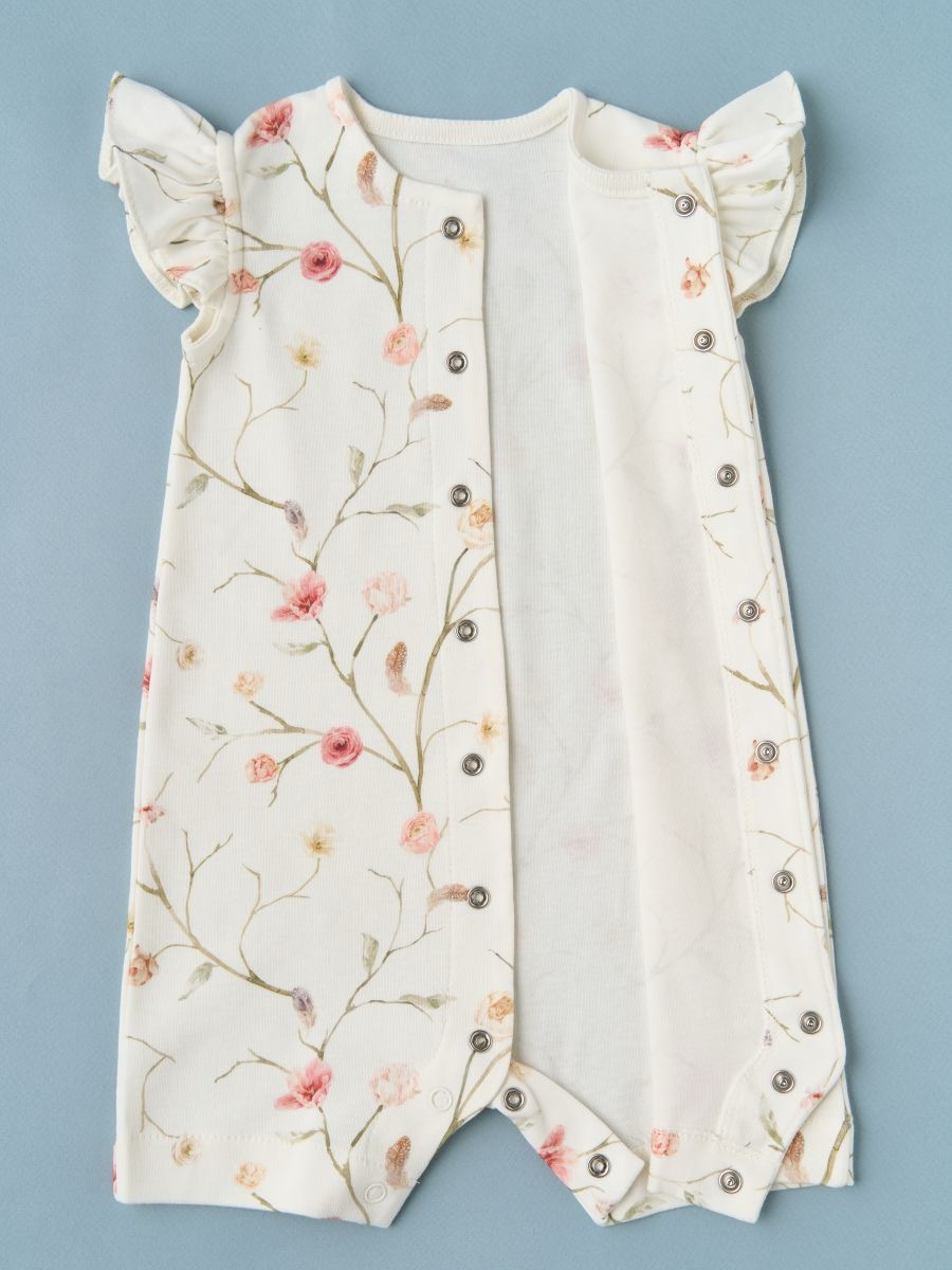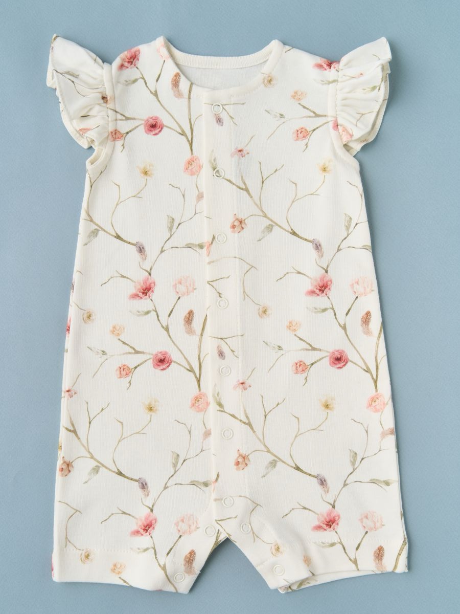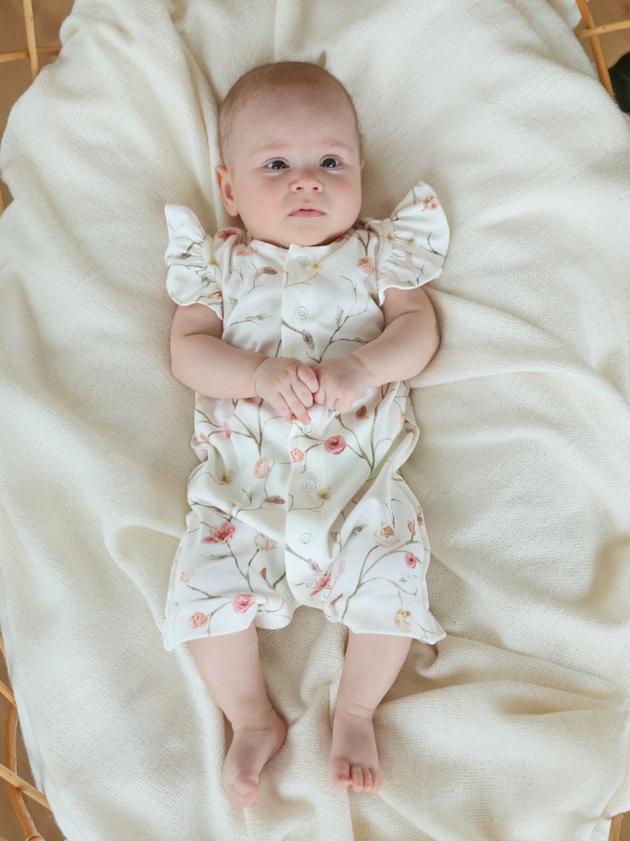 Трикотажный песочник для девочки, 100% хлопок с очаровательными рукавами-крылышками и застёжкой на кнопки по всей длине спереди. Натуральный мягкий трикотаж «дышит», быстро впитывает влагу и подходит для ежедневной носки дома, на прогулке и в поездках. Для этого артикула доступно много разных рисунков: аккуратный принт впечатан в ткань, не боится утюга, выдерживает множество стирок и не выцветает. В размере 62 выполнены швы наружу для максимального комфорта новорождённой кожи; с 68 по 92 размеры — швы внутри в классическом исполнении. Удобные кнопки между ножками помогают быстро сменить подгузник, свободный силуэт не стесняет движения. Ищете милый летний комбинезон для девочки из хлопка? Это удачный выбор как на каждый день, так и в подарок новорождённой.