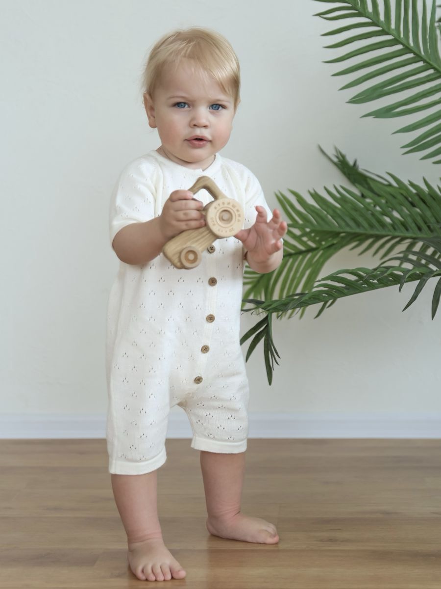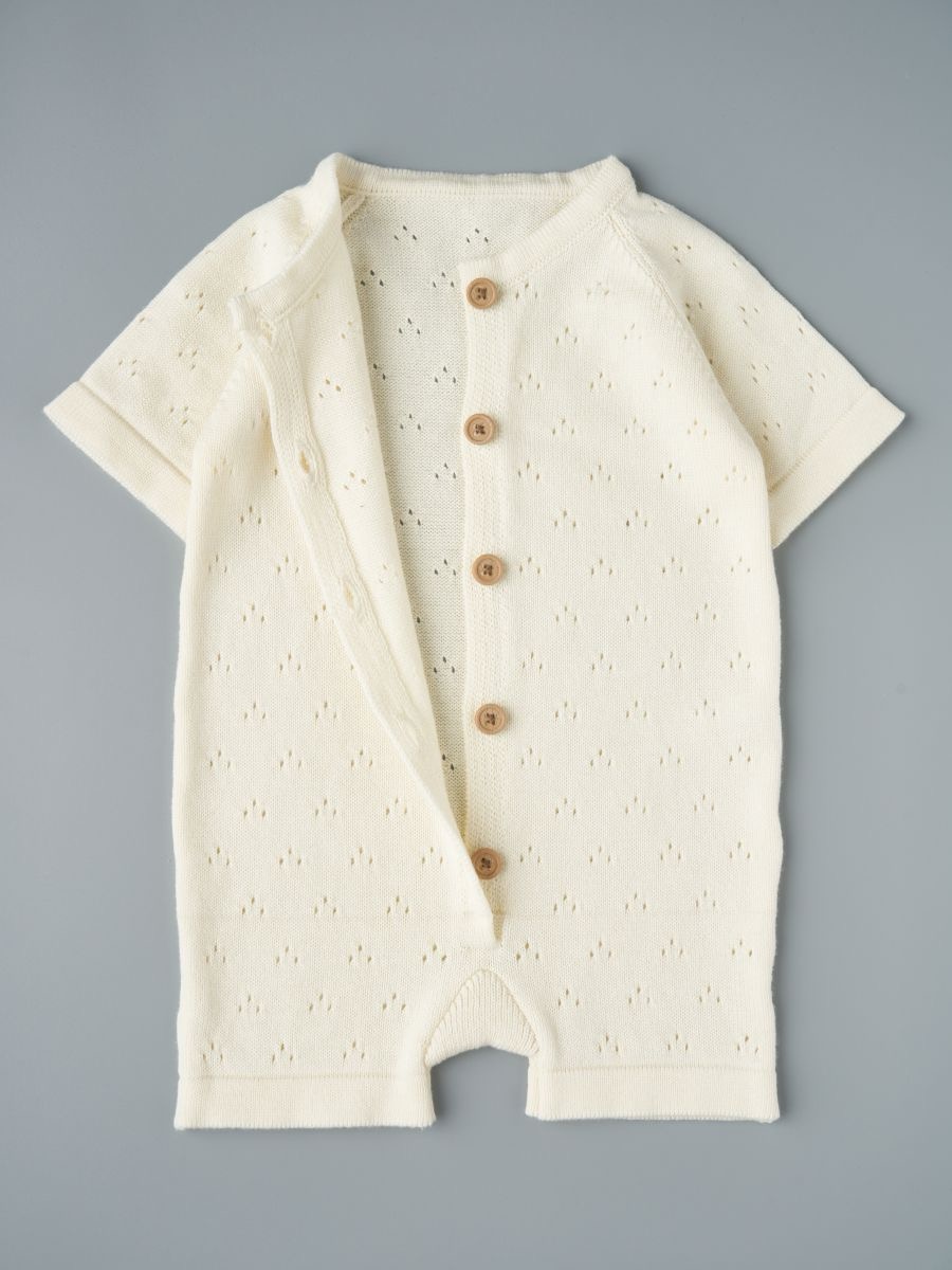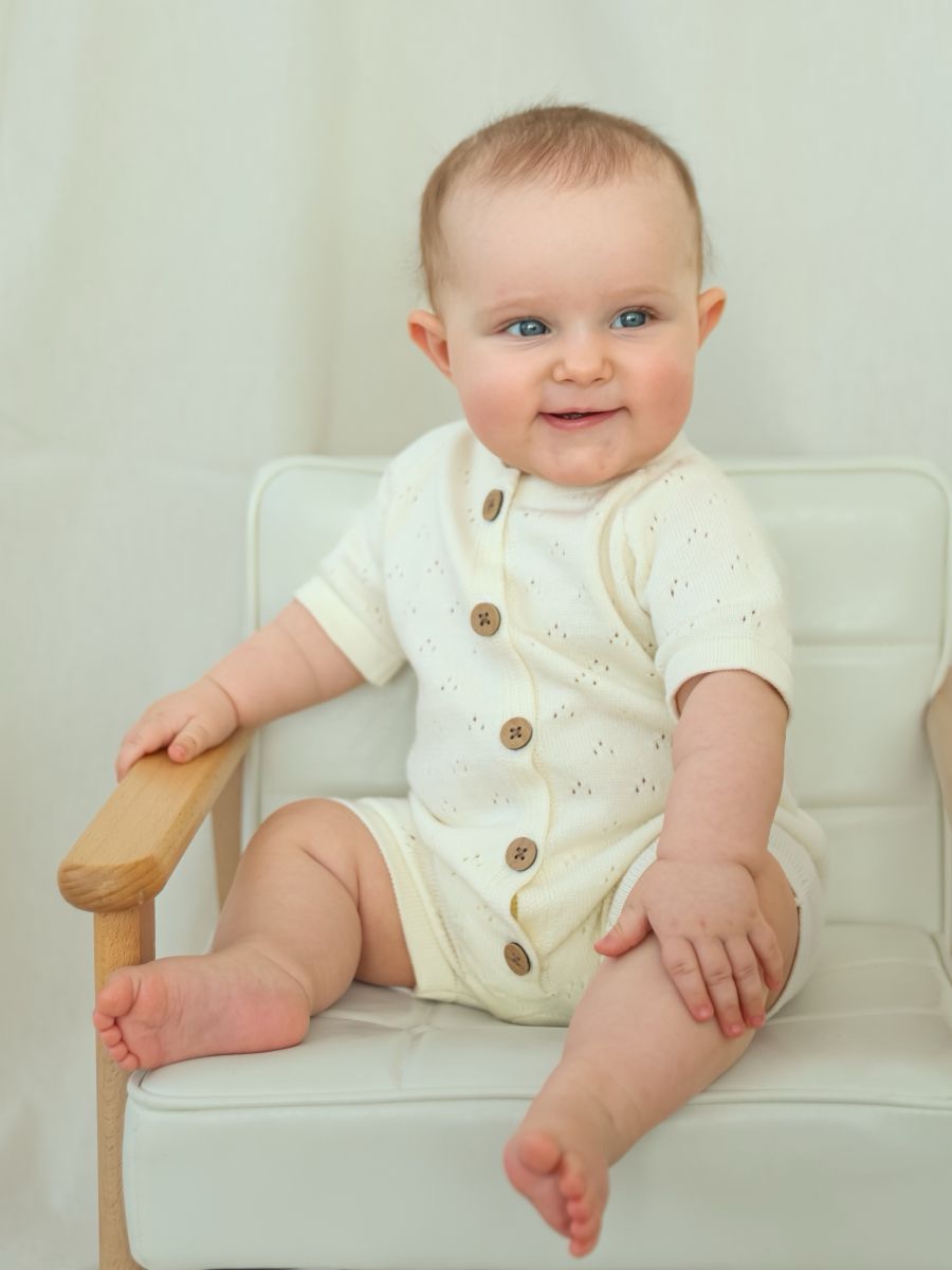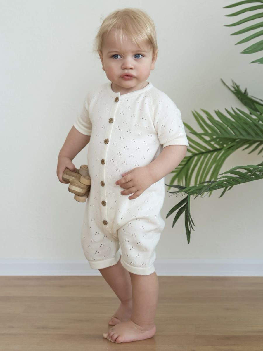 Песочник вязаный из 100% хлопка — лёгкая и дышащая детская вещь для тёплого сезона. Мягкая хлопковая пряжа и трикотажное полотно дарят комфорт новорождённым и малышам, а планка на пуговицах упрощает переодевание. Универсальный дизайн легко вписывается в повседневный гардероб и смотрится нарядно на фотосессиях: такой летний трикотажный песочник из натурального дышащего материала — удачный выбор для дома, прогулок и в качестве подарка.