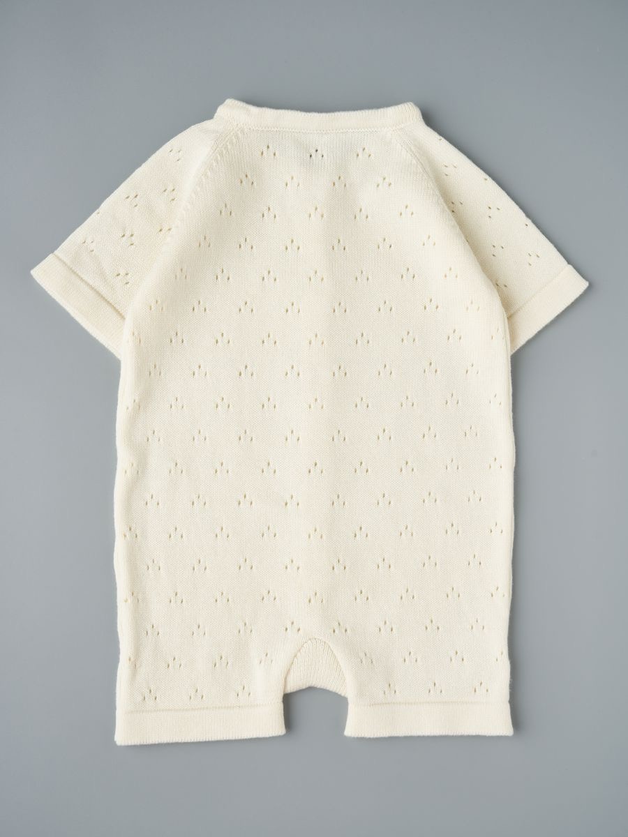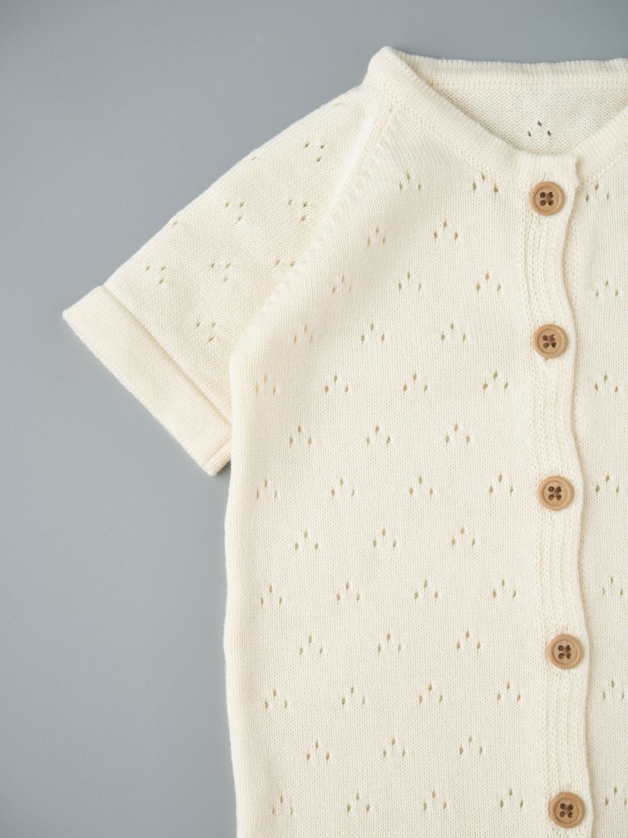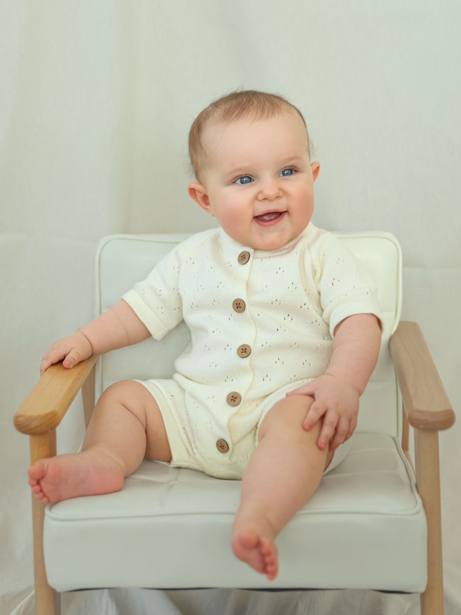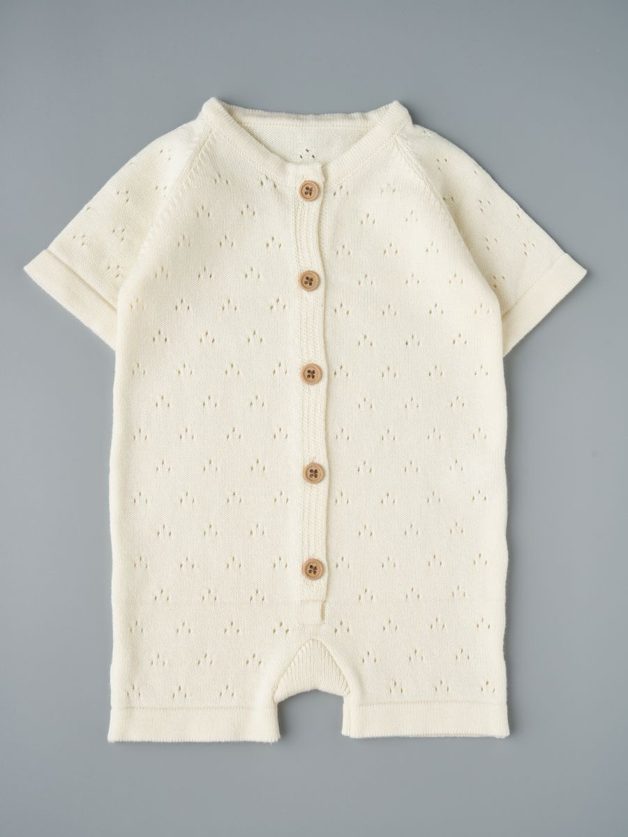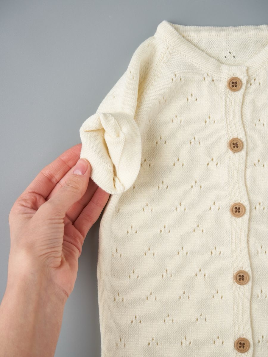 Песочник вязаный из 100% хлопка — лёгкая и дышащая детская вещь для тёплого сезона. Мягкая хлопковая пряжа и трикотажное полотно дарят комфорт новорождённым и малышам, а планка на пуговицах упрощает переодевание. Универсальный дизайн легко вписывается в повседневный гардероб и смотрится нарядно на фотосессиях: такой летний трикотажный песочник из натурального дышащего материала — удачный выбор для дома, прогулок и в качестве подарка.