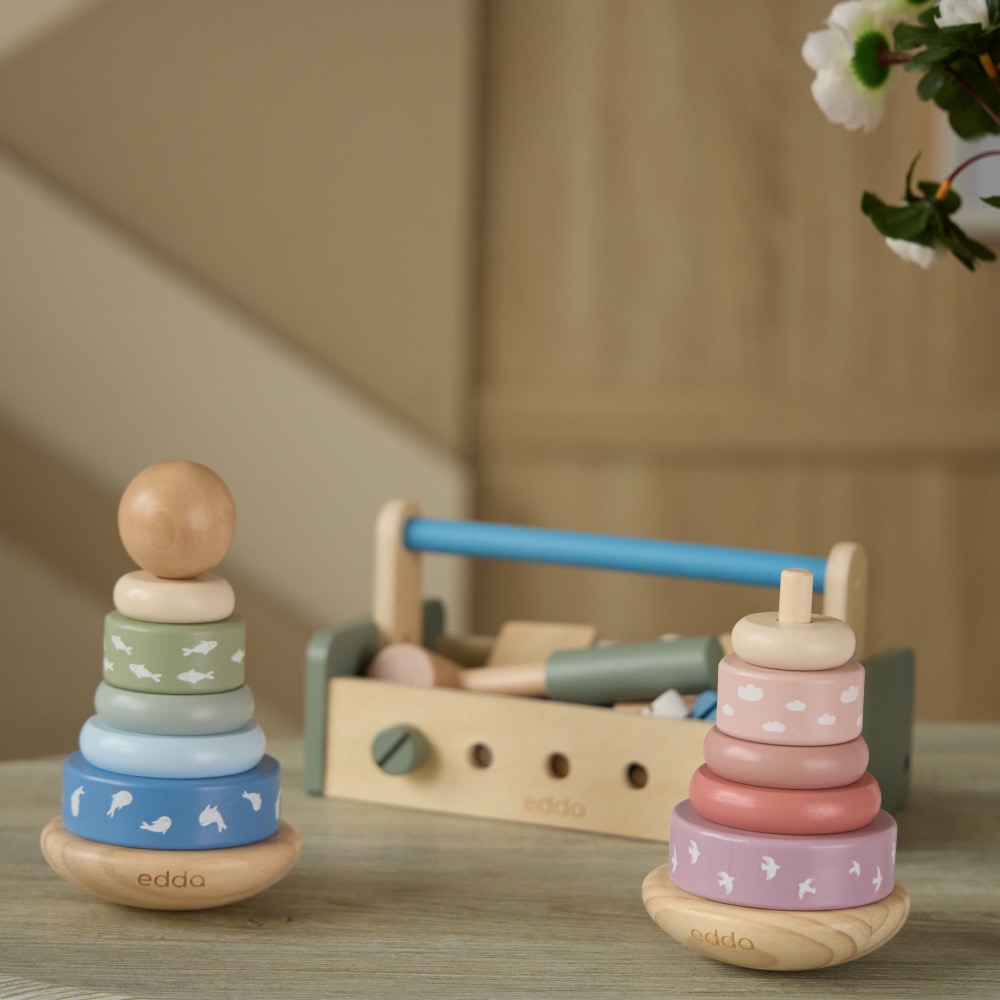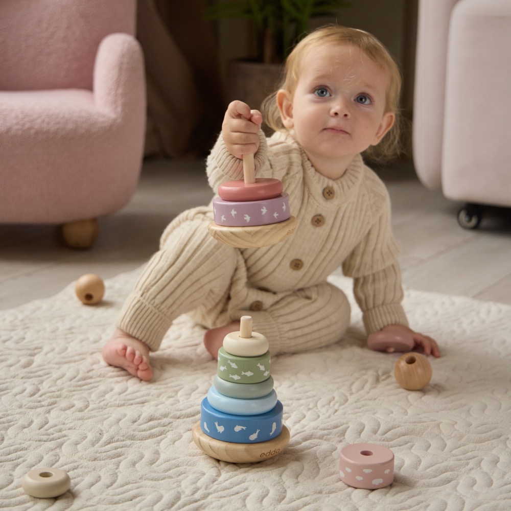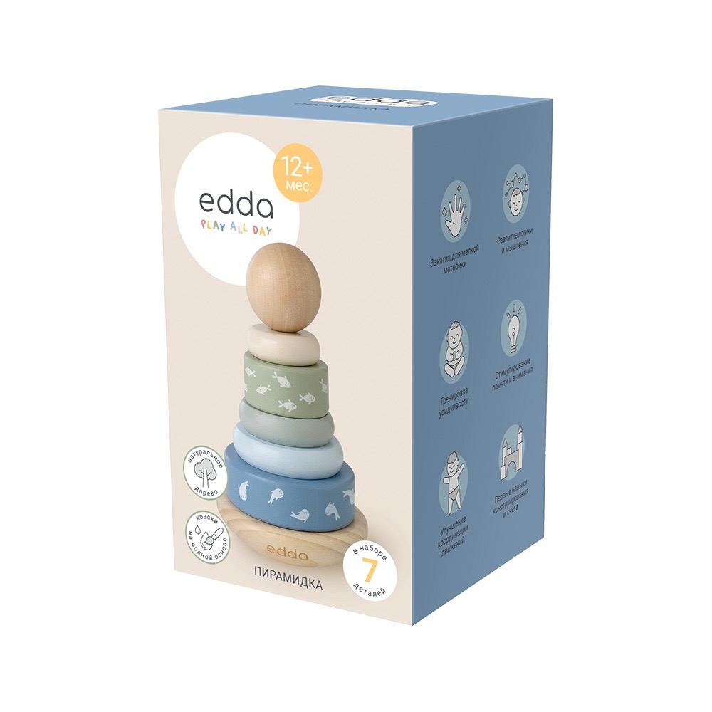 Деревянная пирамидка edda — это эстетика и лаконичный дизайн, сочетающий простые формы и спокойные цвета. Игрушка устойчива в статике, покачивается при небольшом наклоне и возвращается в исходное положение, поэтому малышу весело играть с ней снова и снова. Пирамидка в нежных оттенках помогает малышу развивать координацию, учиться сочетать цвета и органично дополняет интерьер. edda — это поэзия современного детства, где хороший вкус прививается с первых дней жизни.