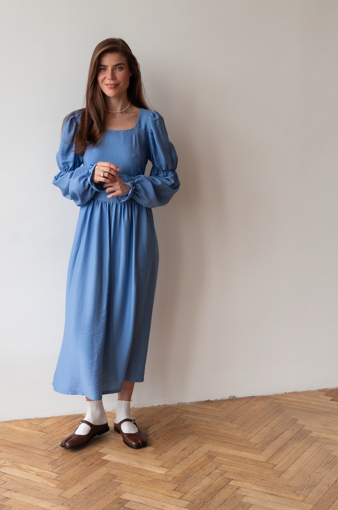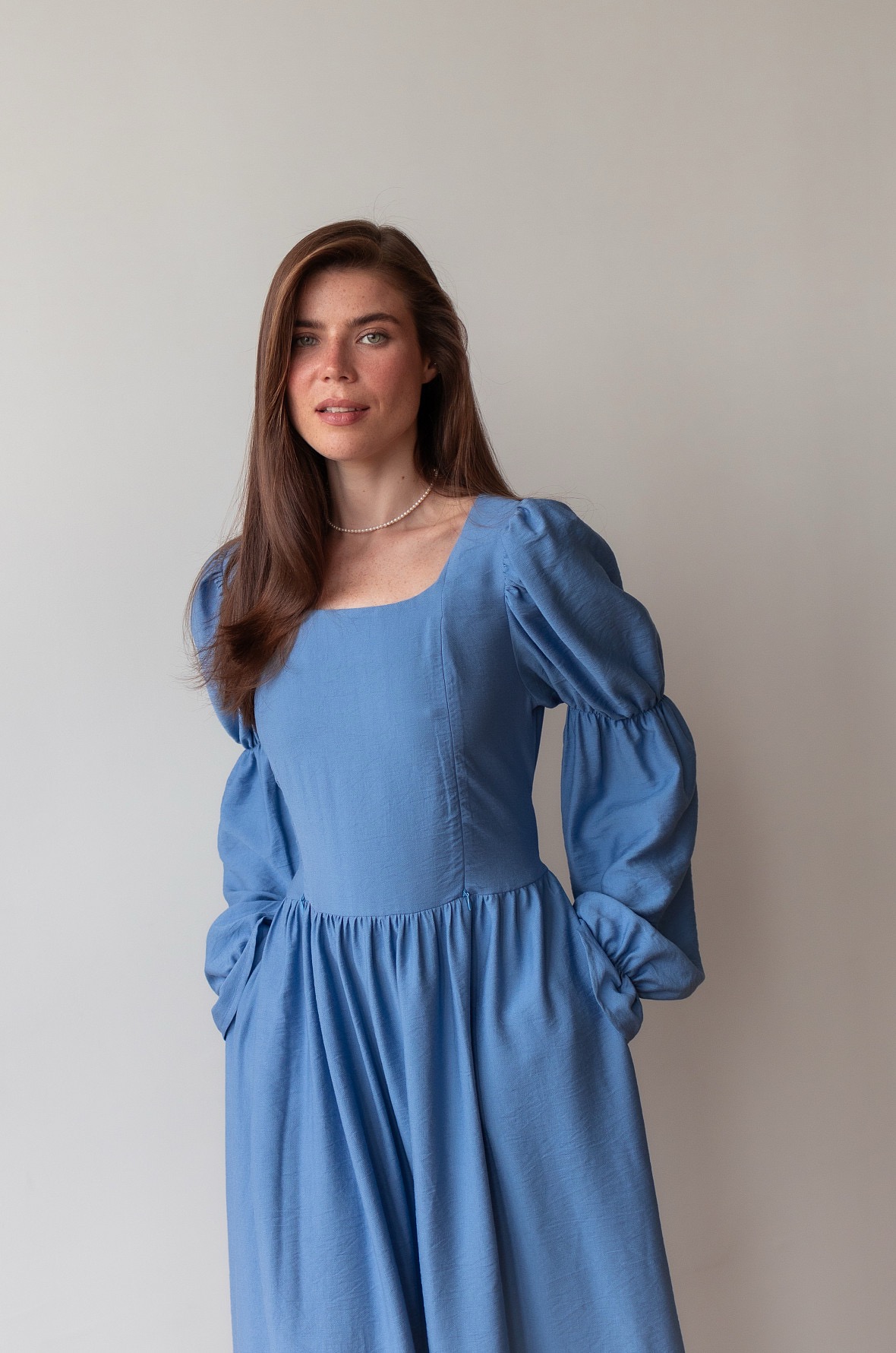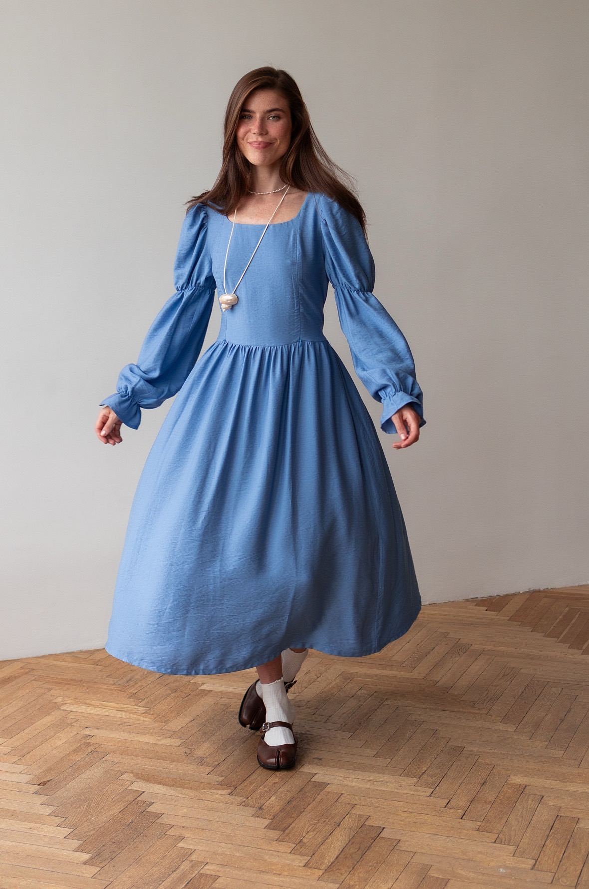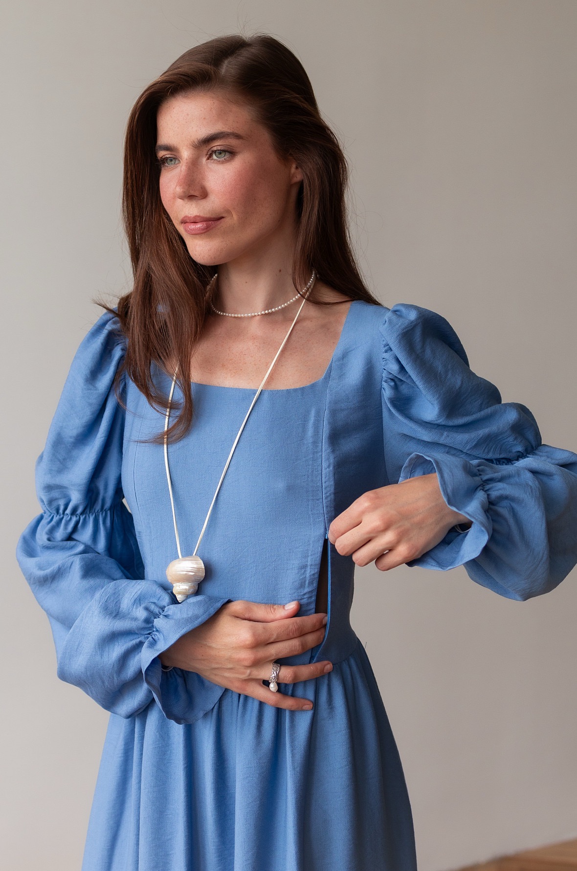 Почувствуйте себя героиней романов Джейн Остен. Необыкновенно красивое платье в романтическом стиле. Изящные рукава, мягкий овальный вырез и восхитительная шнуровка на спине, благодаря которой вы можете регулировать силуэт подчеркивая талию. Платье также подойдет на беременный животик.