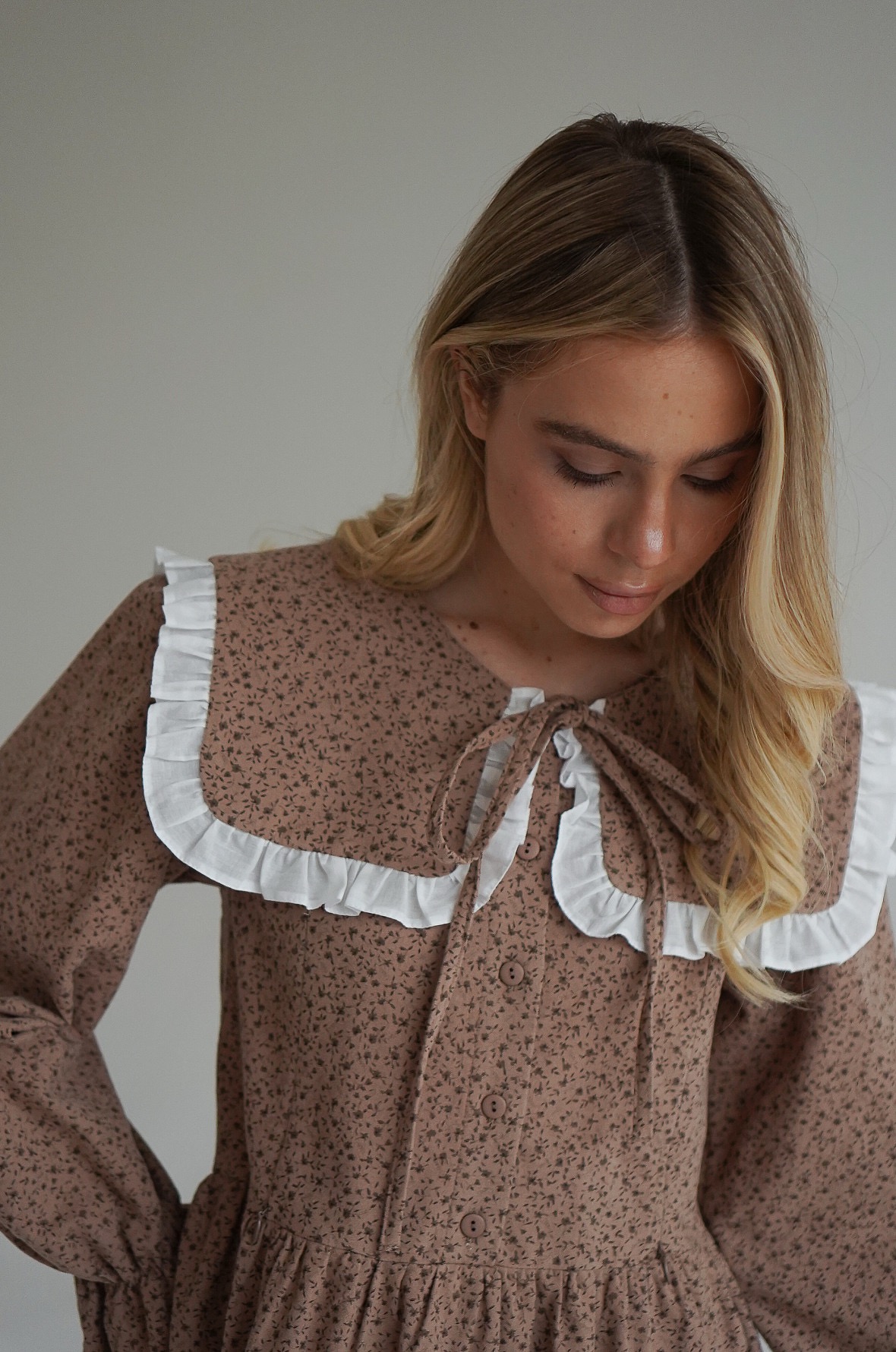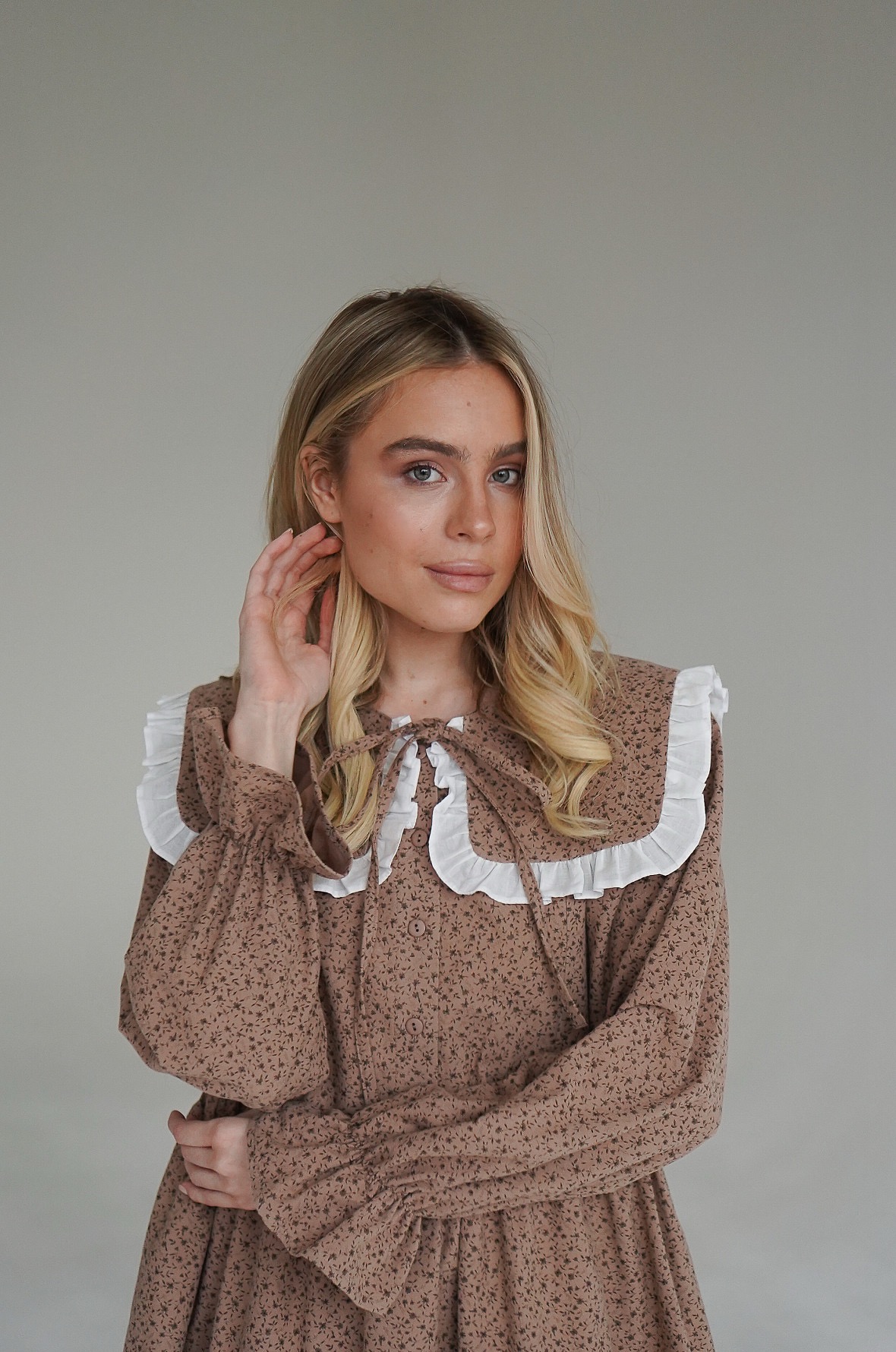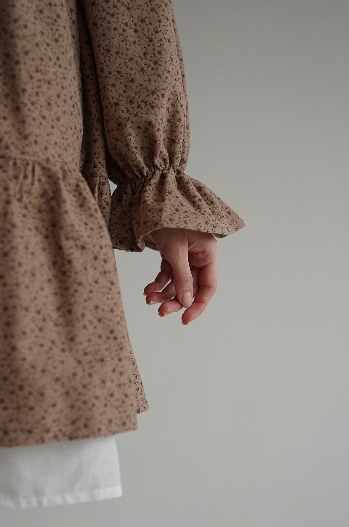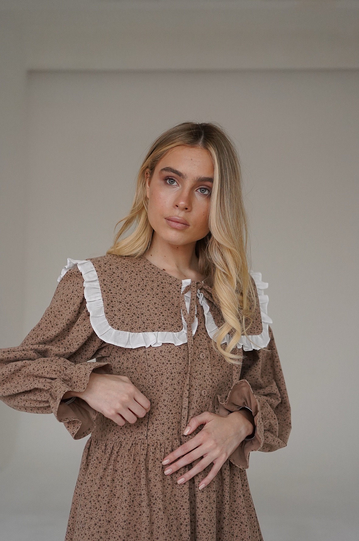 Параметры модели: платье бежевое с цветами: рост 170, грудь 83, талия 60, бедра 89, на модели платье в размере 40; платье кремовое с пионами: рост 176, грудь 81, талия 61, бедра 91, на модели платье в размере 42.