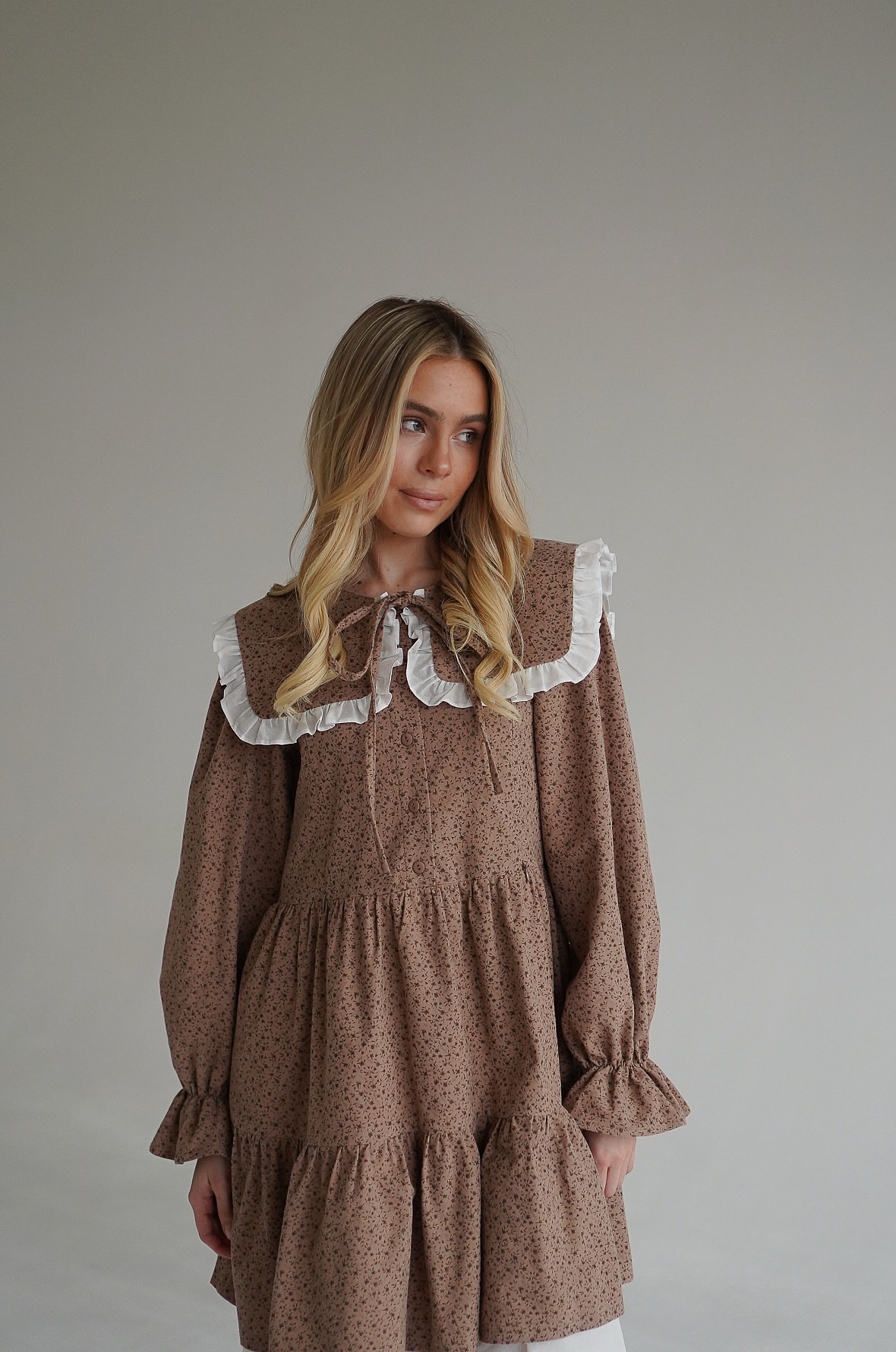 Восхитительное платье из мягкого, теплого хлопка фланели. Воротничок съемный, подъюбник вшит в линию талии. В комплекте идет тонкий поясок. При желании, можно подчеркнуть талию. Благодаря свободному фасону, платье подойдет и на период беременности. А незаметные молнии в вытачках лифа сделают комфортнее жизнь кормящей мамы.