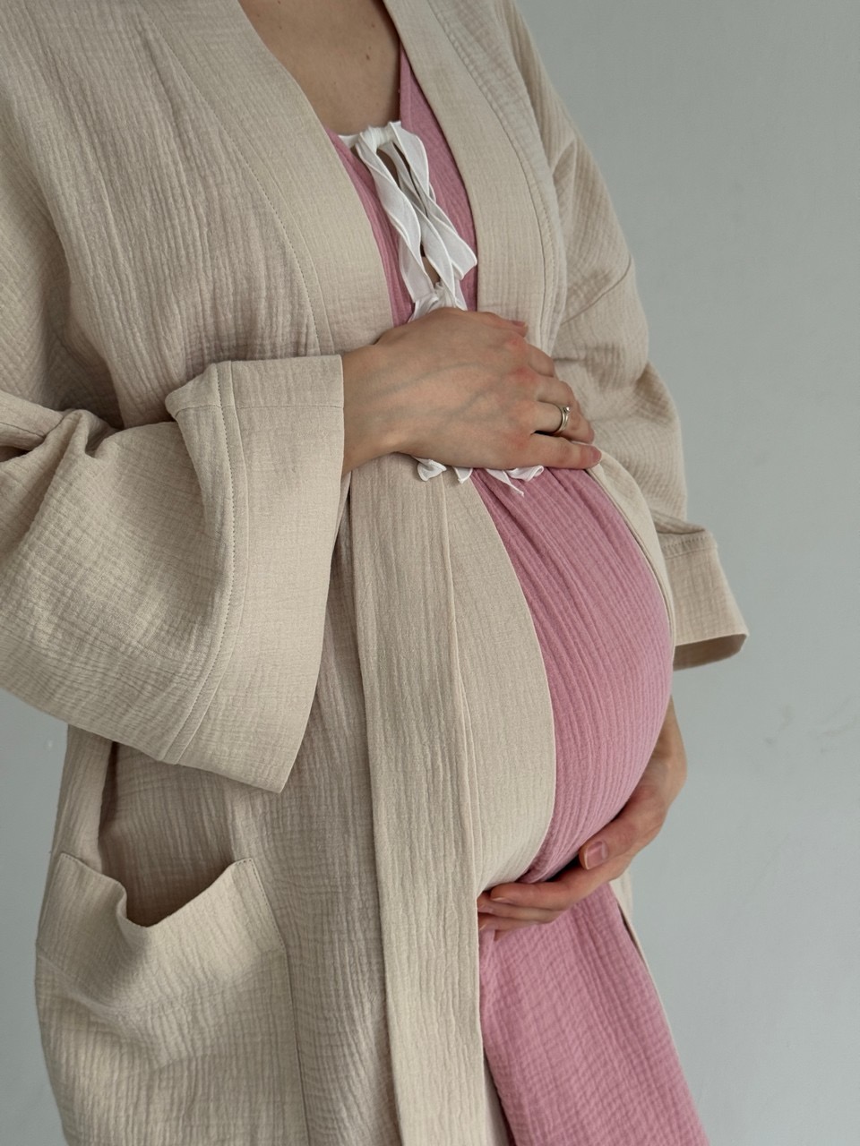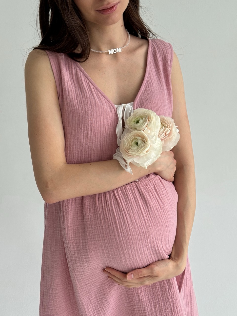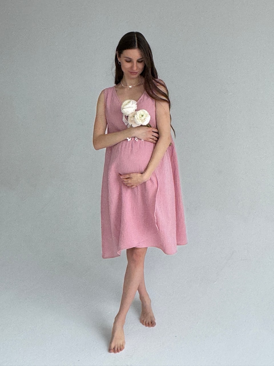 Платье для самого важного дня - первой встречи с вашим малышом. Никто из нас не знает, по какому сценарию могут пойти роды, но мы постарались предусмотреть разные варианты развития событий чтобы вы могли полностью расслабиться и думать только о том, что скоро вы увидитесь с малышом. Раздвижные крылышки на юбке спереди и сзади для комфортных осмотров, проживания схваток на фитболе и установки аппарата КТГ. Благодаря раздвижным крылья на юбке и чуть поднятой линии талии, ваш помощник в родах сможет получить легкий доступ к пояснице чтобы сделать массаж облегчающий схватки. И, конечно, мы предусмотрели вырез на груди с эстетичными лентами для комфортного кормления малыша грудью.