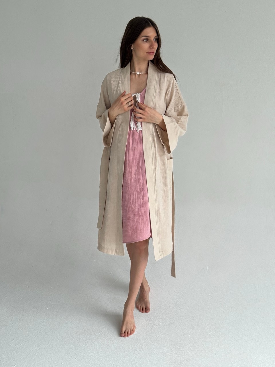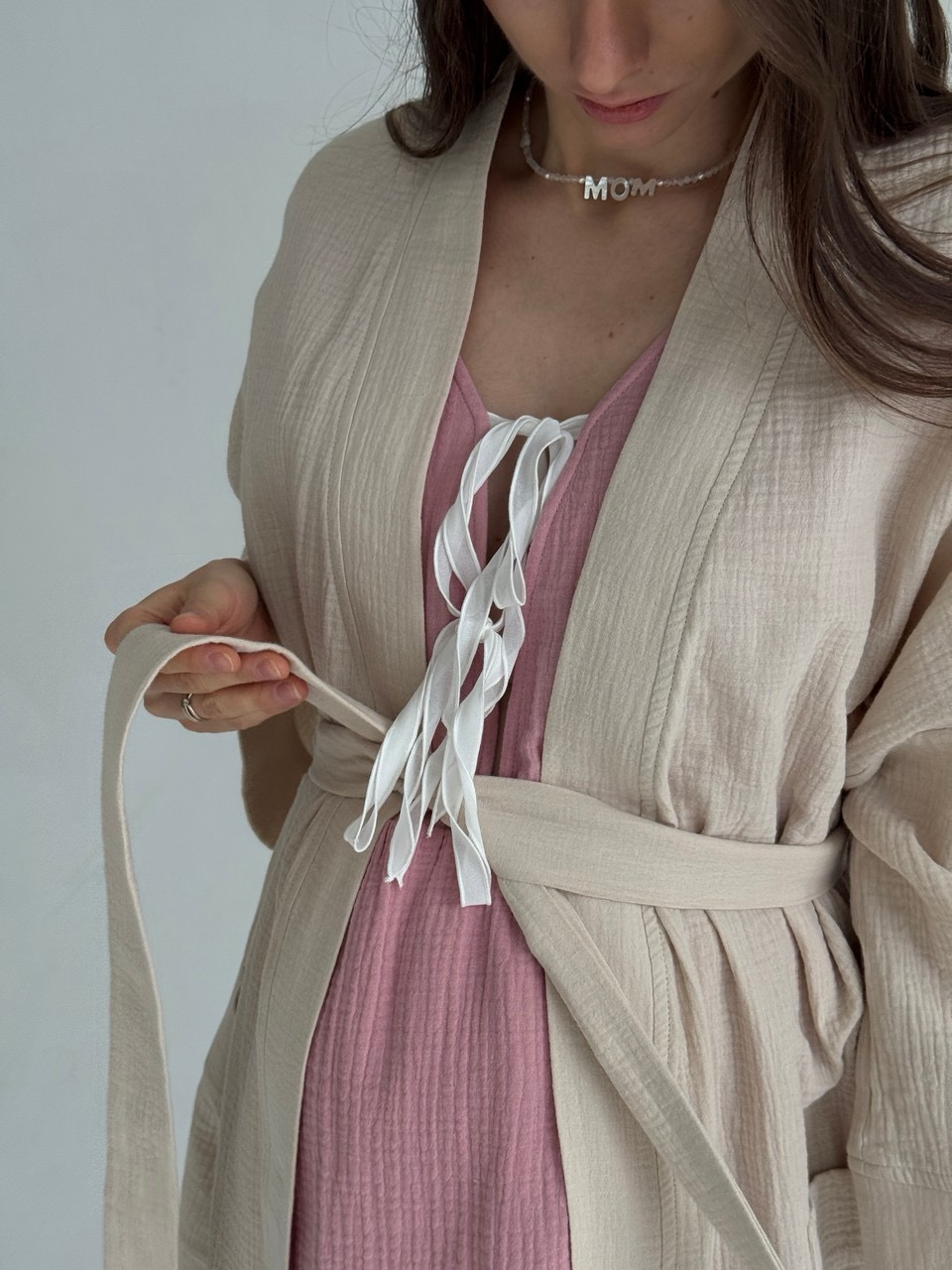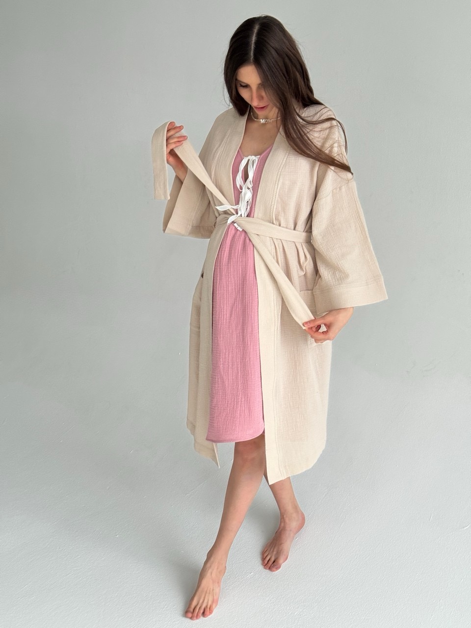 Платье для самого важного дня - первой встречи с вашим малышом. Никто из нас не знает, по какому сценарию могут пойти роды, но мы постарались предусмотреть разные варианты развития событий чтобы вы могли полностью расслабиться и думать только о том, что скоро вы увидитесь с малышом. Раздвижные крылышки на юбке спереди и сзади для комфортных осмотров, проживания схваток на фитболе и установки аппарата КТГ. Благодаря раздвижным крылья на юбке и чуть поднятой линии талии, ваш помощник в родах сможет получить легкий доступ к пояснице чтобы сделать массаж облегчающий схватки. И, конечно, мы предусмотрели вырез на груди с эстетичными лентами для комфортного кормления малыша грудью.