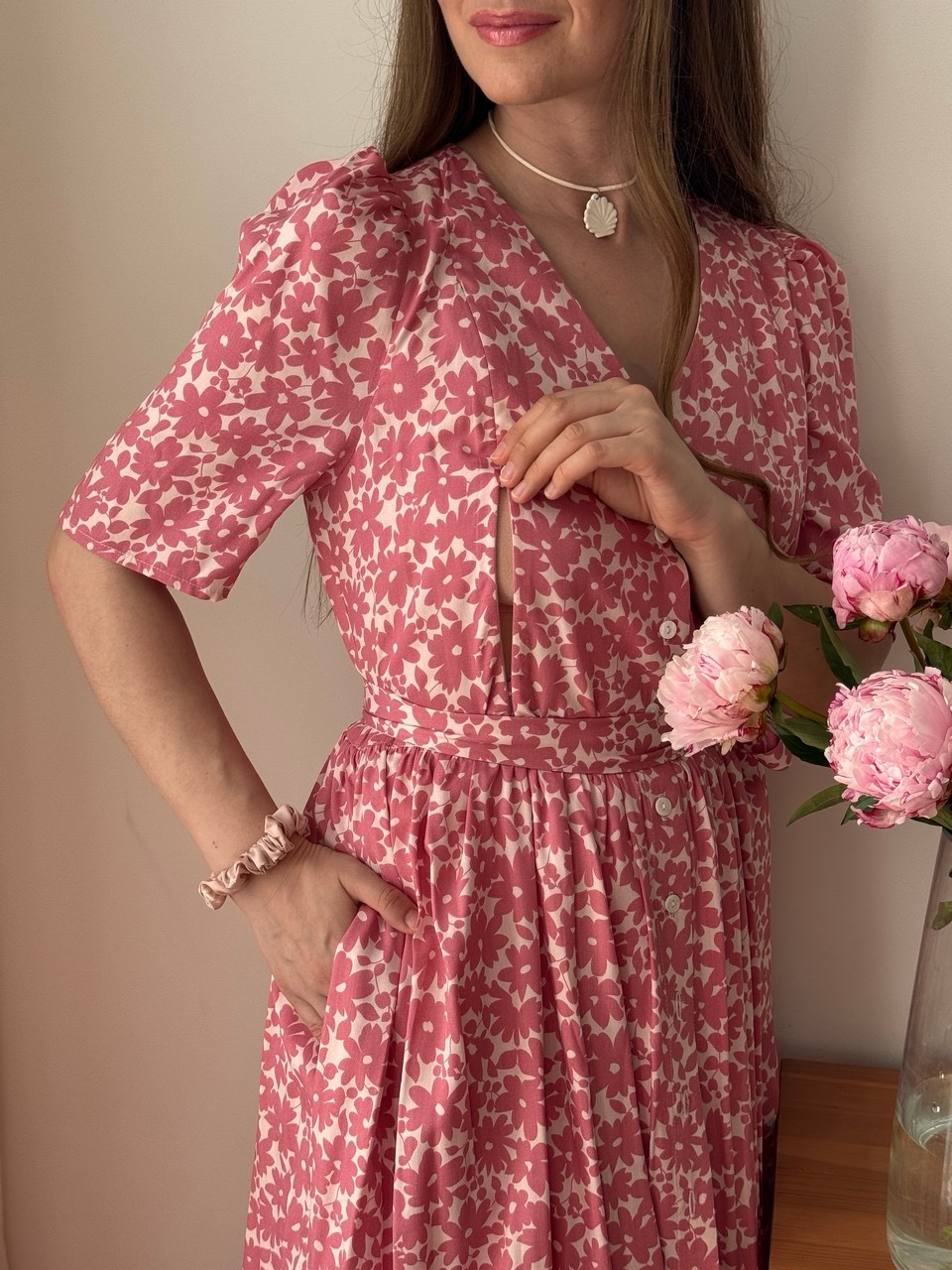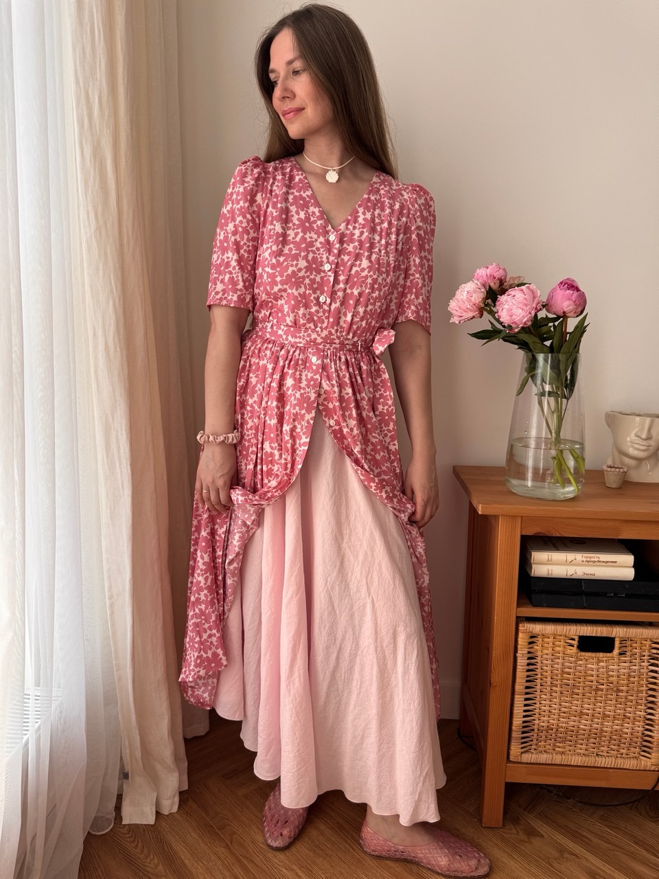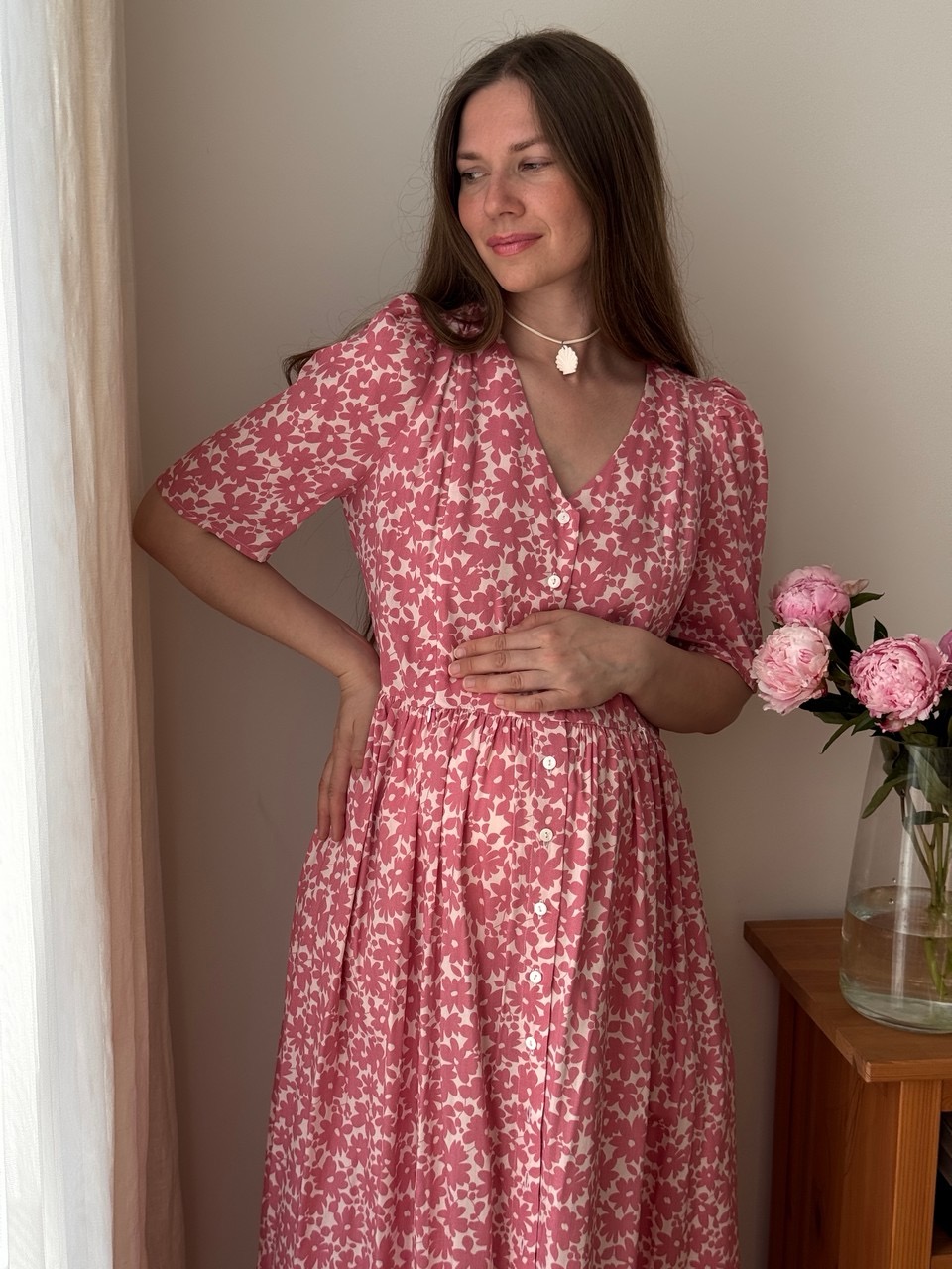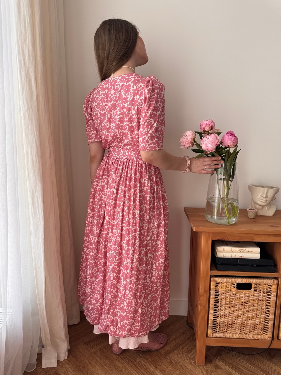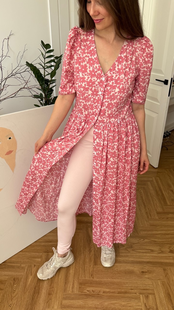 Параметры модели: Рост 170, грудь 84, талия 60, бедра 90, на модели платье в размере 42. Параметры модели изделий в цвете Синий с белыми цветами, Пудровый с розовыми цветами, Мятный с фрезиями, Айвори с акварельными цветами: Грудь 88 см, талия 65 см, бедра 92 см, рост 171 см, На модели изделие в размере 44.