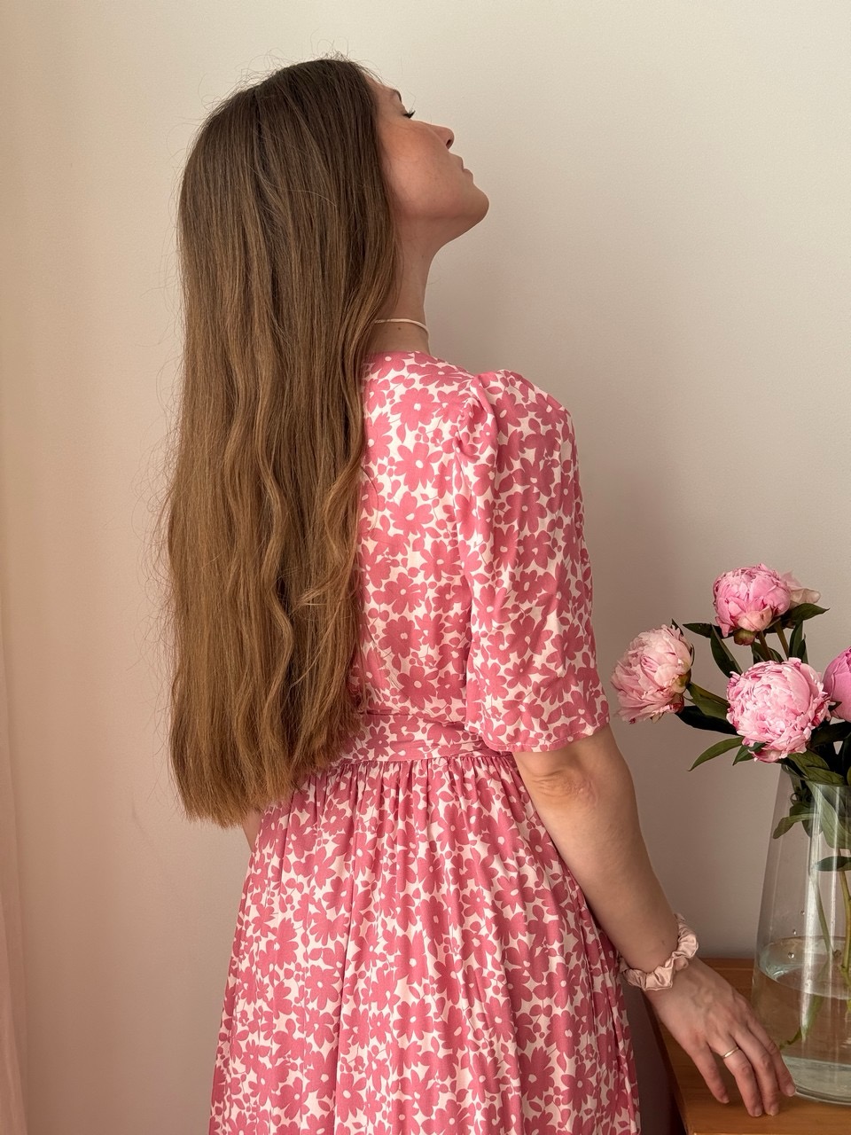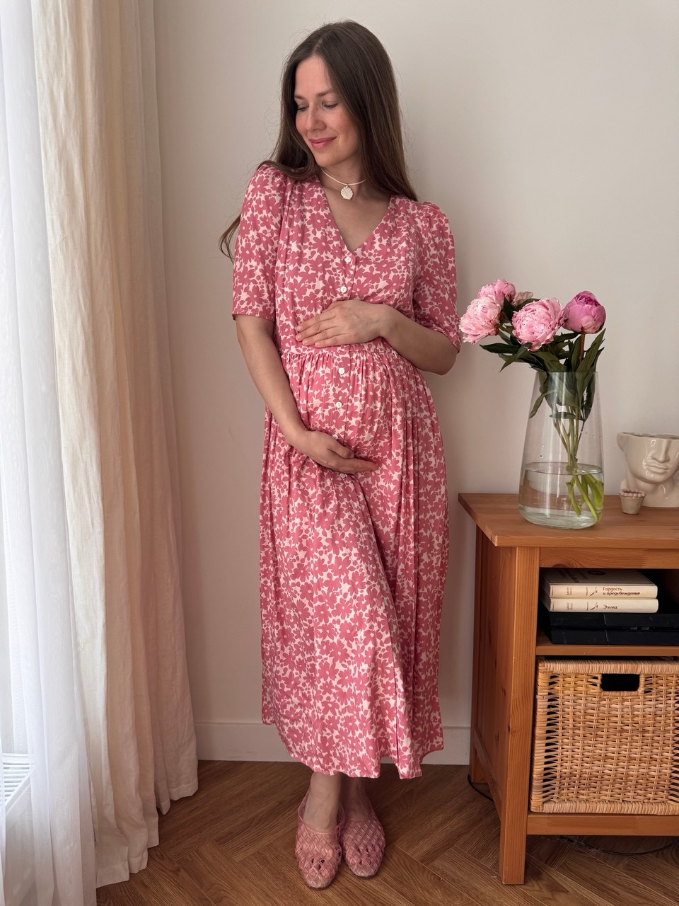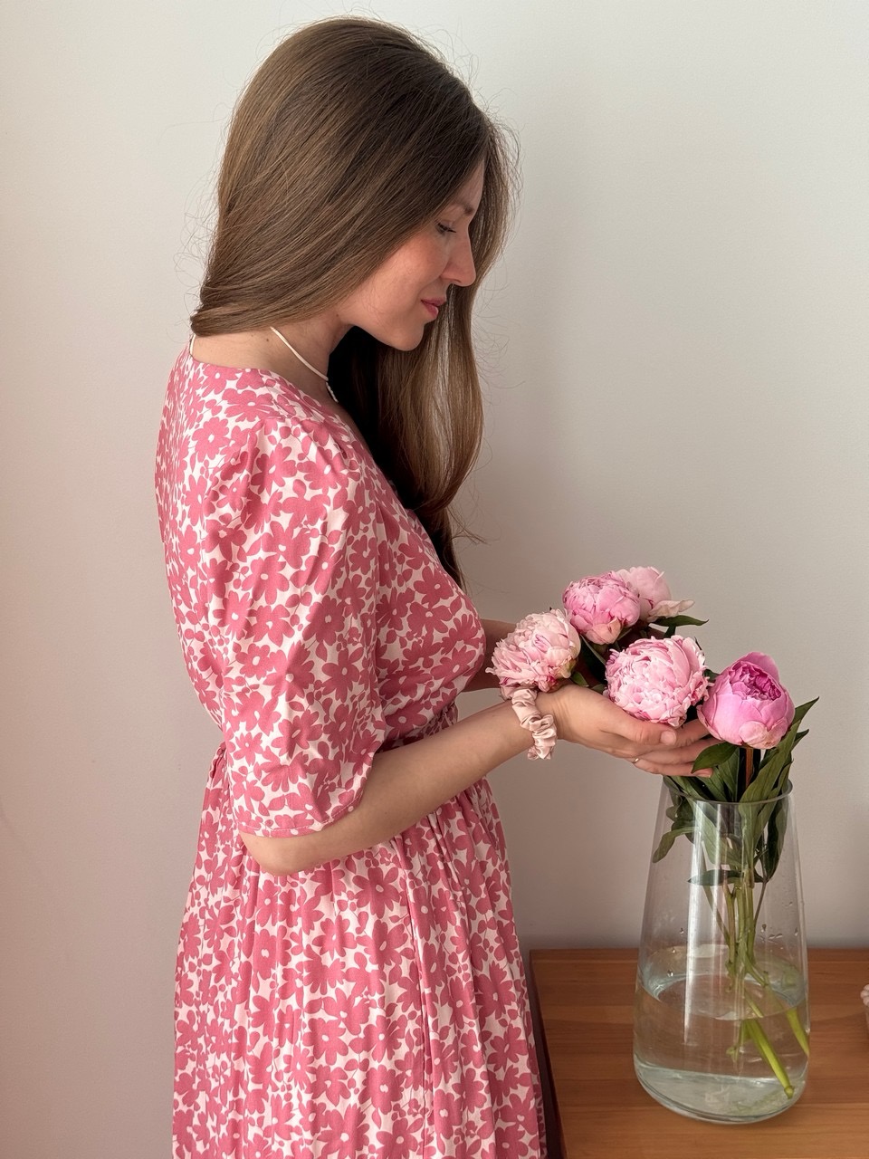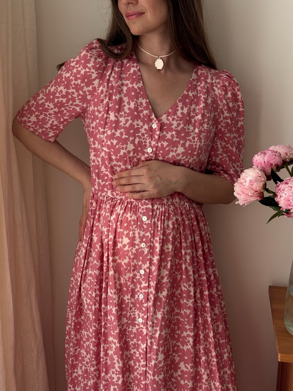 Параметры модели: Рост 170, грудь 84, талия 60, бедра 90, на модели платье в размере 42. Параметры модели изделий в цвете Синий с белыми цветами, Пудровый с розовыми цветами, Мятный с фрезиями, Айвори с акварельными цветами: Грудь 88 см, талия 65 см, бедра 92 см, рост 171 см, На модели изделие в размере 44.
