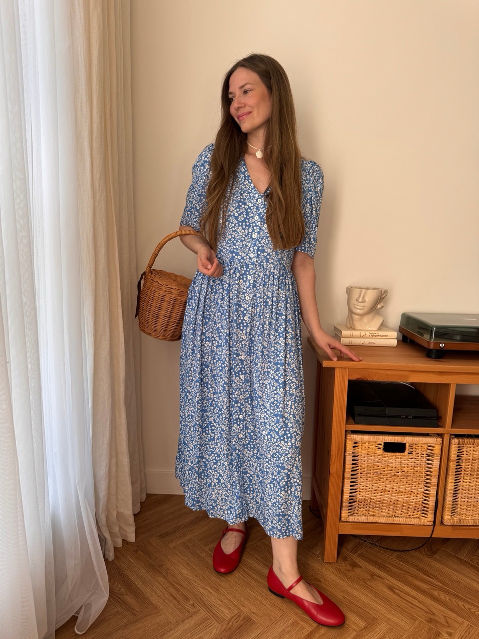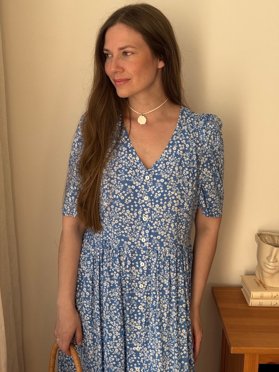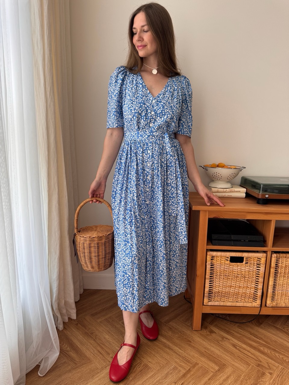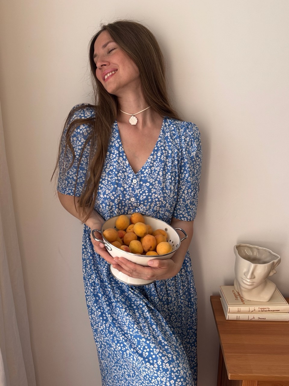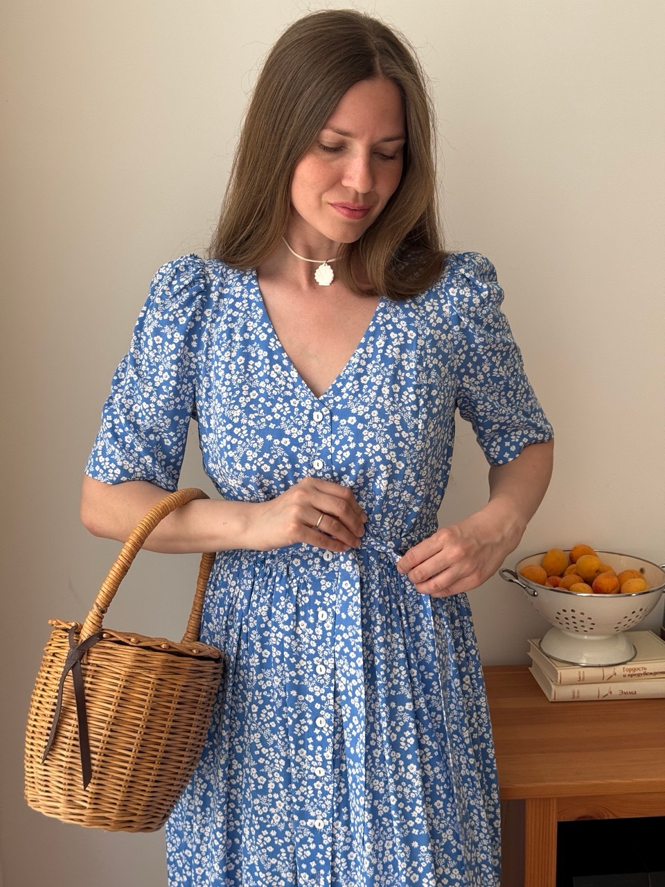 Параметры модели: Рост 170, грудь 84, талия 60, бедра 90, на модели платье в размере 42. Параметры модели изделий в цвете Синий с белыми цветами, Пудровый с розовыми цветами, Мятный с фрезиями, Айвори с акварельными цветами: Грудь 88 см, талия 65 см, бедра 92 см, рост 171 см, На модели изделие в размере 44.