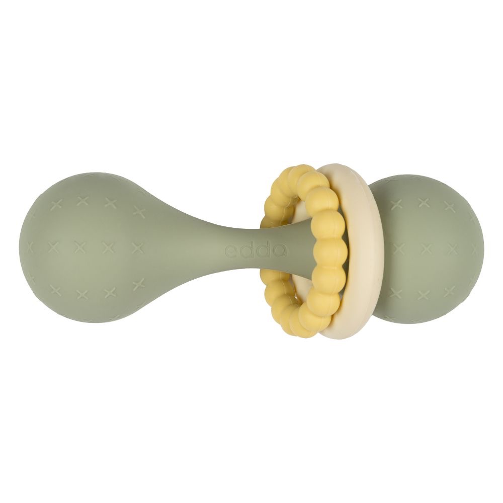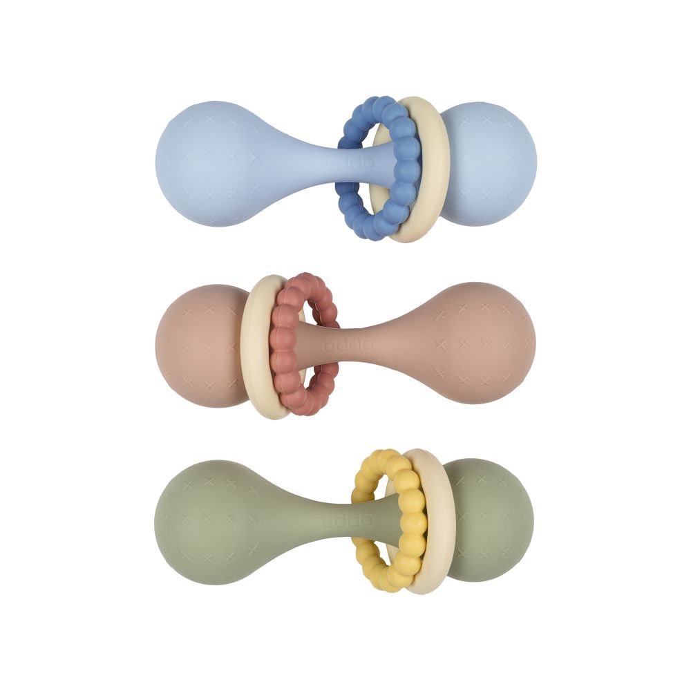 У лёгкой погремушки edda — эргономичная форма, которая идеально подходит для детских ладошек. Рельефная поверхность массирует дёсны при кусании, но не повреждает их, выполняя функцию прорезывателя. Игрушка тренирует сенсорное восприятие. На корпусе есть два дополнительных подвижных колечка для развития моторики. Погремушка из гипоаллергенного силикона издаёт успокаивающий звук и развивает ребенка через игру. Спокойные цвета игрушки гармонично впишутся в домашний интерьер.