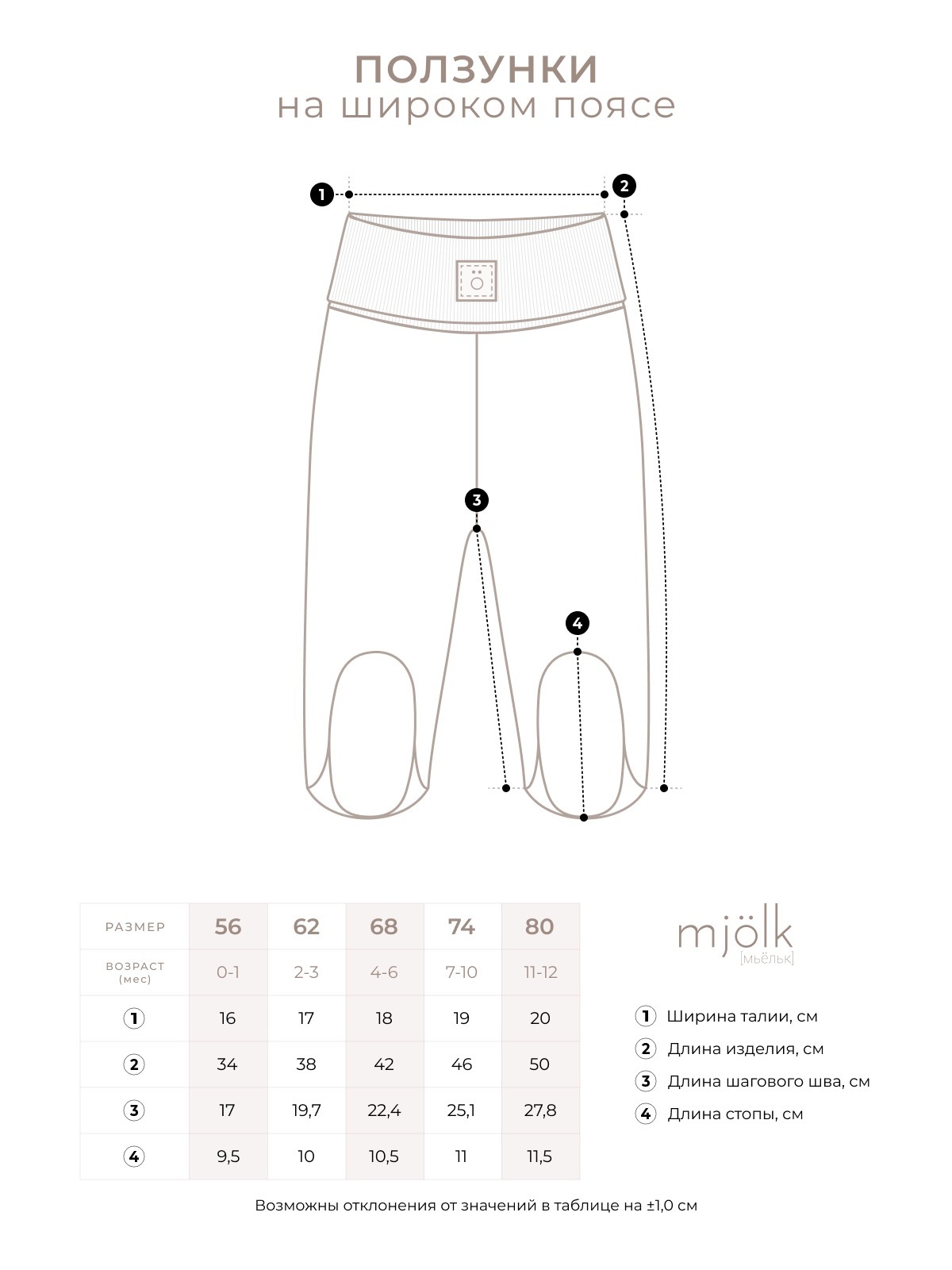 Ползунки Mjölk [мьёльк] выполнены в теплой расцветке. Благодаря широкому и эластичному поясу штанишки не спадают с ребёнка, легко надеваются и хорошо поддерживают памперс. Пояс позволяет легко регулировать высоту посадки, поэтому ползунки подойдут для носки с любой одеждой. Закрытая ножка садится по стопе малыша и не требует надевания носочков.