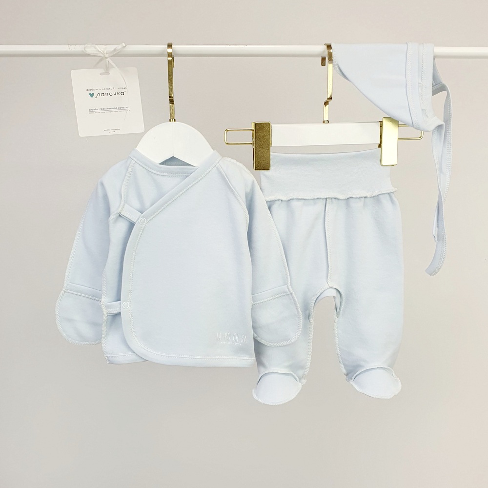 Базовая распашонка для малышей в нежном голубом оттенке. Модель выполнена с запахом и рассчитана на комфортное использование в первые месяцы жизни: легко надевается и аккуратно фиксируется.
