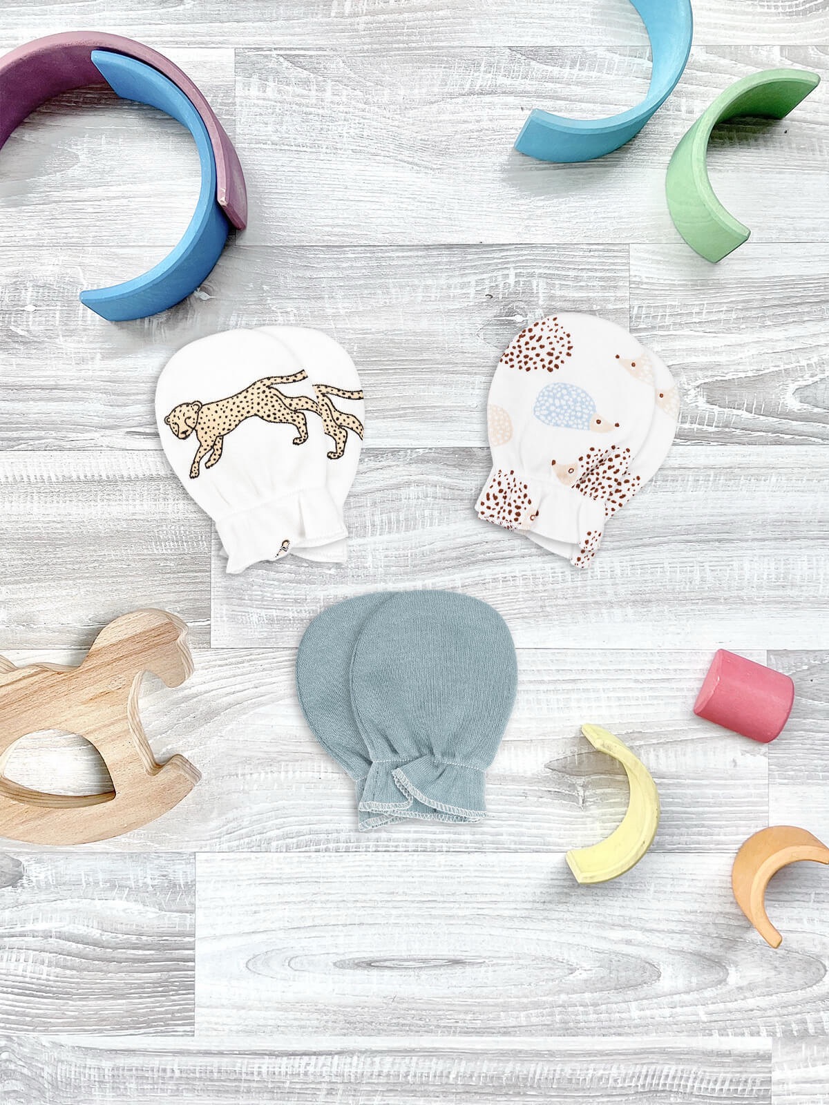 Рукавички-антицарапки Mjolk Ёжики на экрю/Baby Blue/Гепарды сет из 3х пар