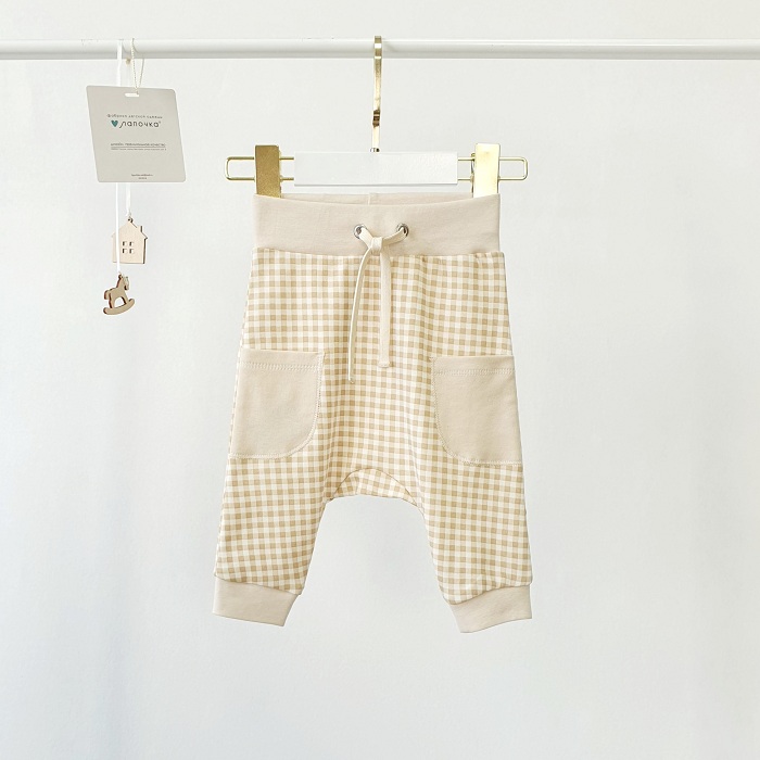 Штанишки для малыша из мягкого трикотажа с принтом в клетку. Пояс на резинке с шнурком удобно фиксирует штанишки и не давит на живот. Свободный крой не стесняет движения ребёнка во время игр и прогулок. Низ брюк на манжетах, штанины не задираются. Накладные карманы добавляют удобство и аккуратный акцент в образе.