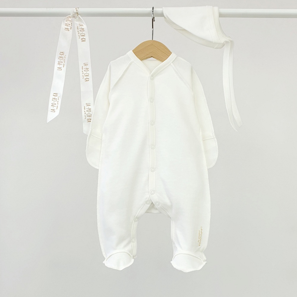 Слип из мягкого трикотажа в белом цвете. Модель с длинным рукавом и застёжкой на кнопки по переду. Подходит для сна и ежедневной носки, удобен как первый слой под верхнюю одежду.