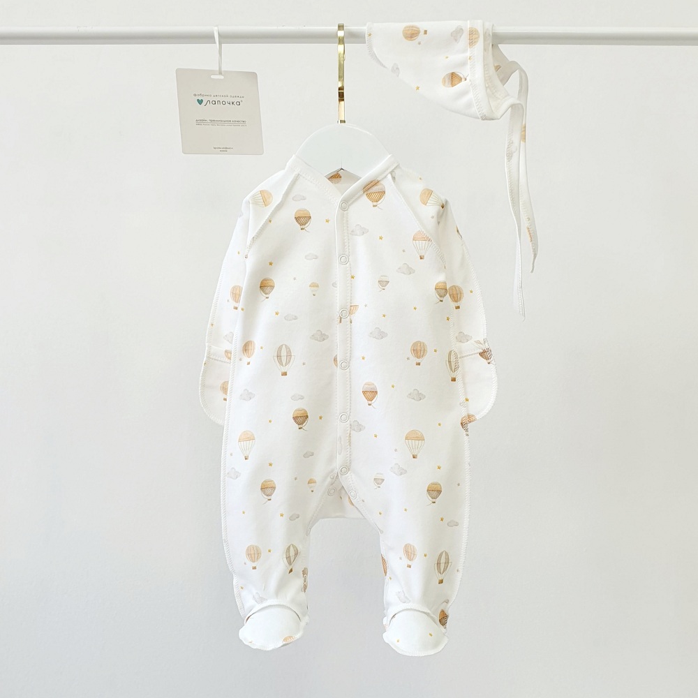 Слип из мягкого трикотажа в светлом оттенке с принтом (воздушные шары, облака, звёзды). Модель с длинным рукавом и кнопками по всей длине. Подходит для сна и ежедневной носки.