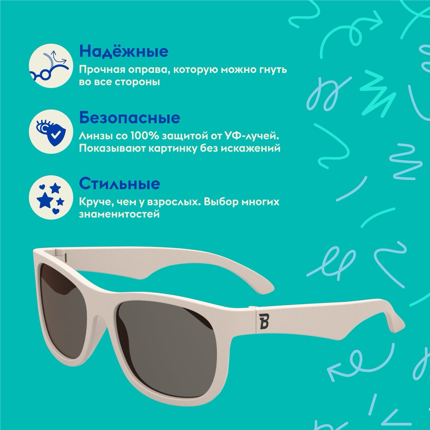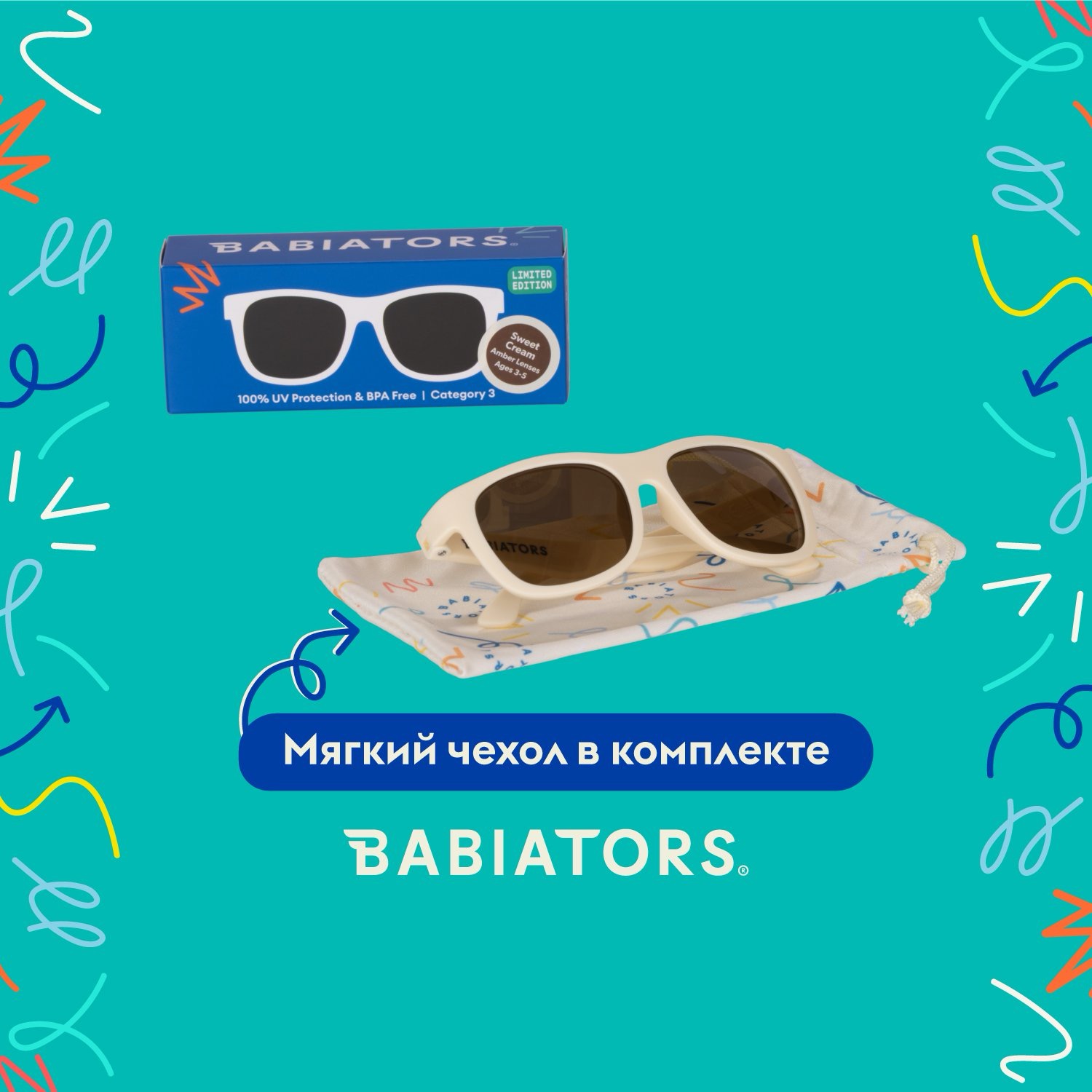 ☀️ Безопасные: степень защиты линз Babiators – UV400. Они обеспечивают 100% защиту от UVA и UVB и проходят тщательные тестирования, чтобы убедиться, что они безопасны для вашего ребёнка.