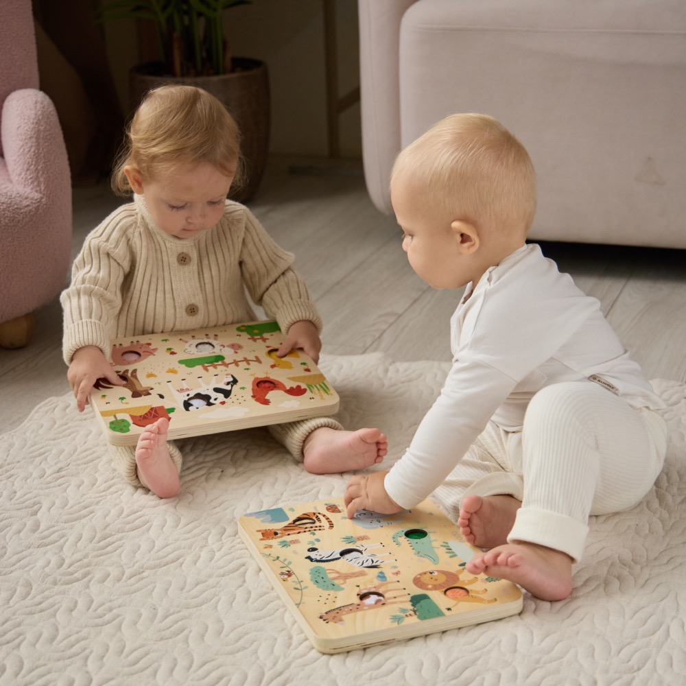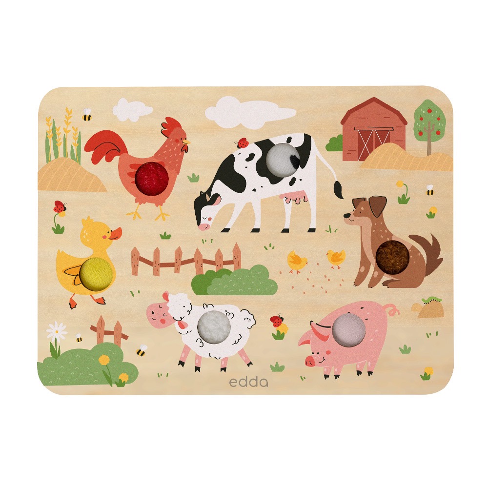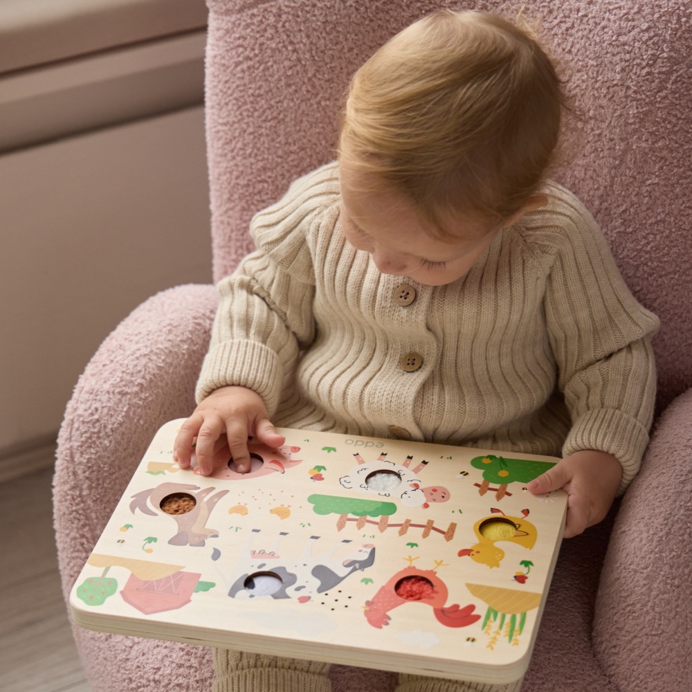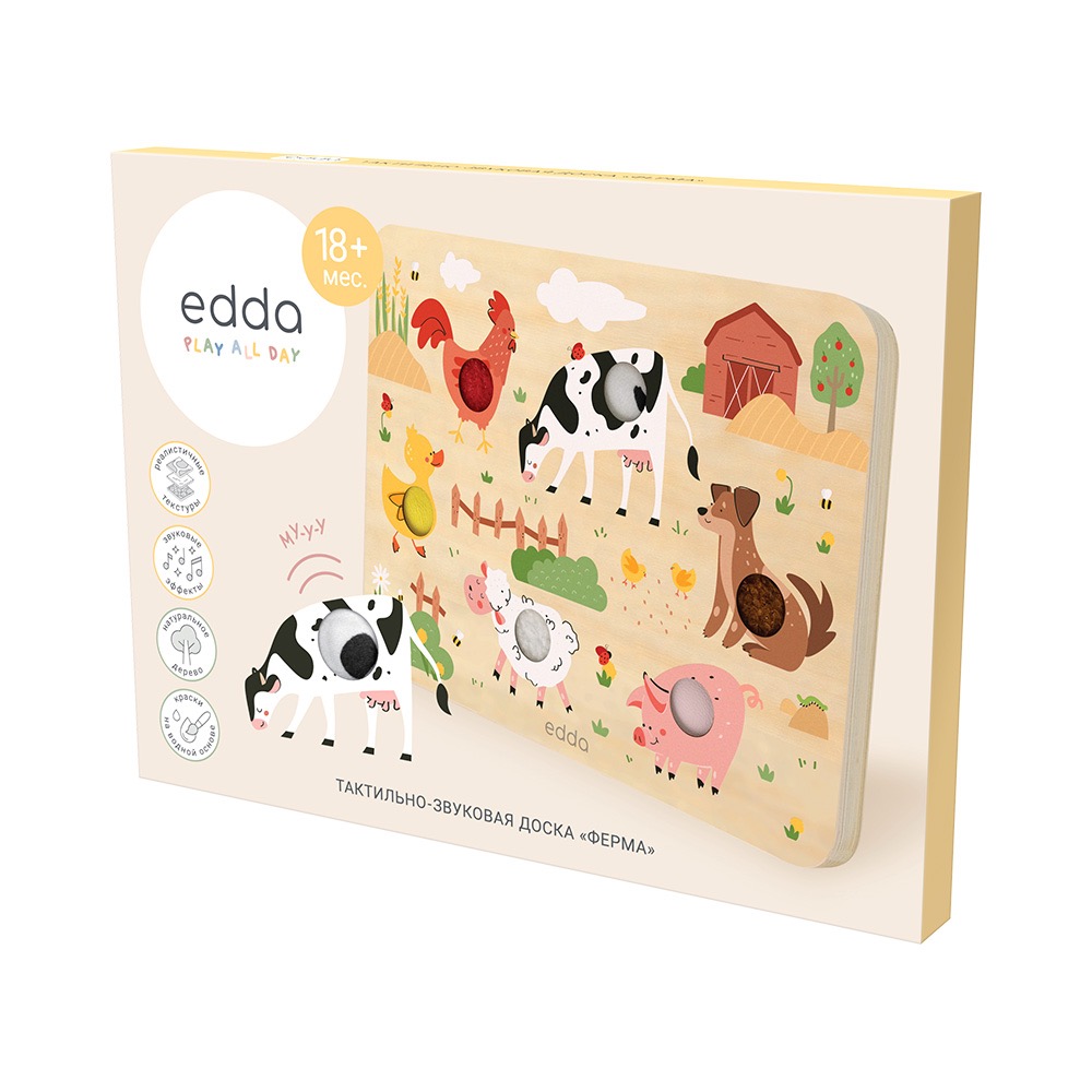 Уникальные развивающие тактильно-звуковые доски edda: при нажатии кнопки на доске воспроизводятся реалистичные звуки животных, а сами кнопки имеют тактильные вставки-текстуры. Такие игры способствуют мультисенсорному развитию ребёнка и позволяют увлечь малыша надолго – как в самостоятельной игре, так и в игре-обучении с близкими. Для разнообразных игровых сценариев доступно два варианта дизайна: «Сафари» и «Ферма».