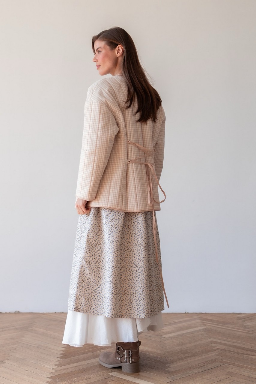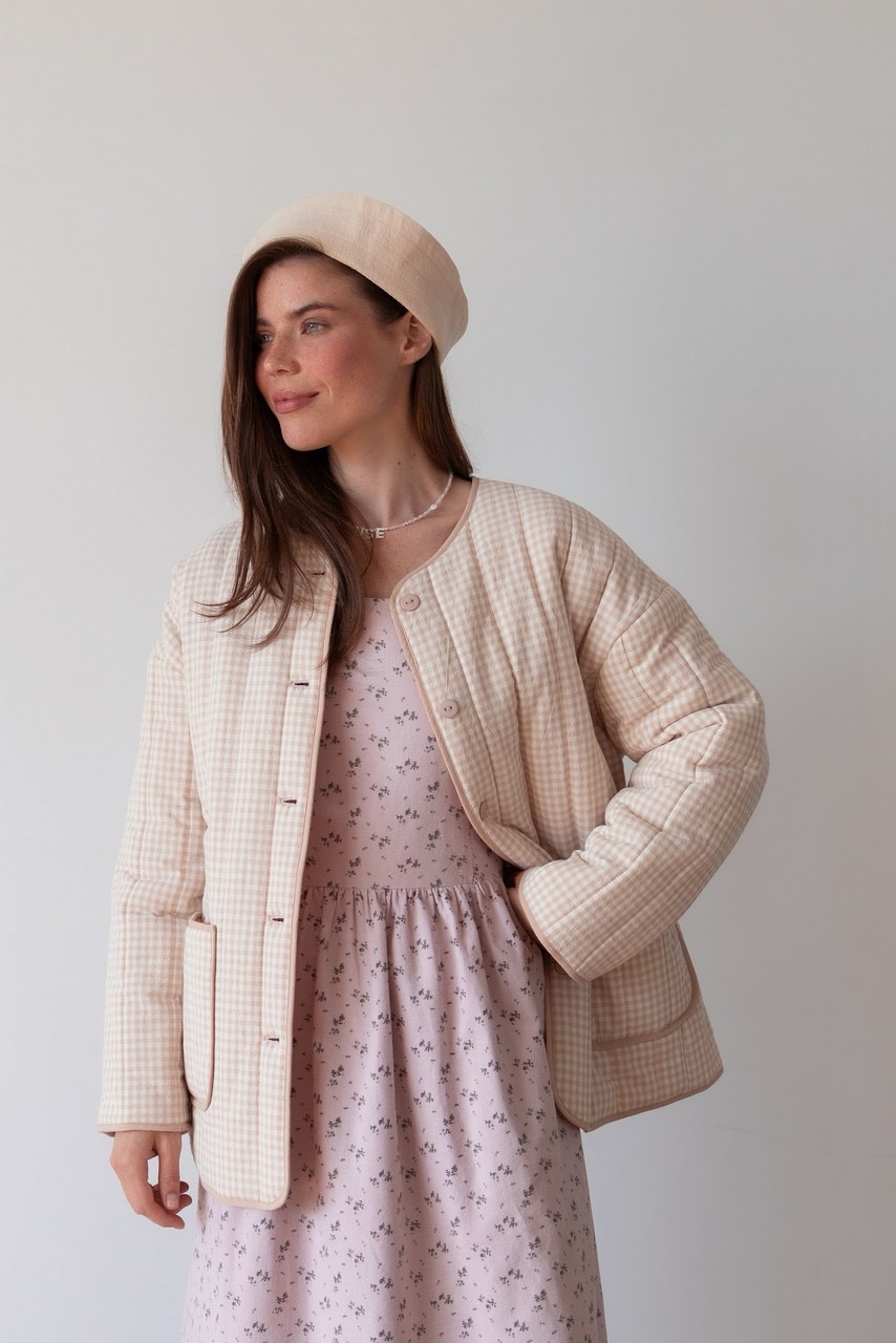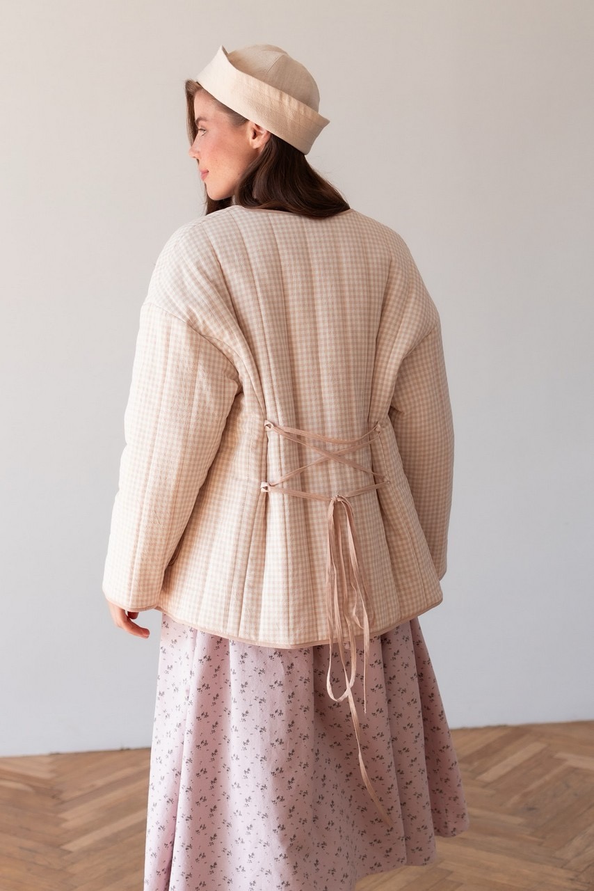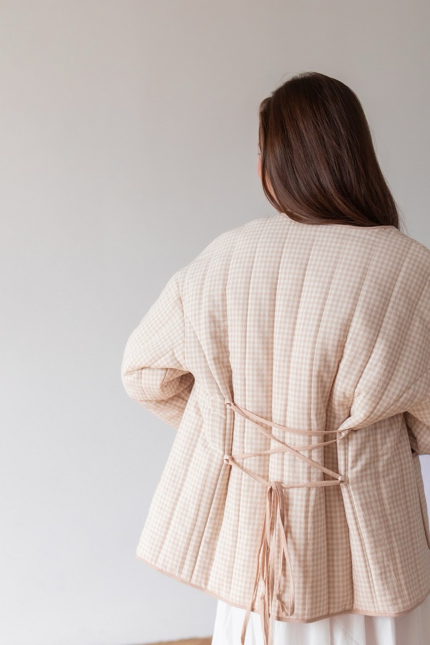 Стёганая телогрейка с накладными карманами - стильная, легкая и уютная. Выполнена из приятного к телу натурального хлопка. Воздушный утеплитель 150 гр. согреет вас осенью, весной и прохладным летом. А изящная декоративная шнуровка на спинке - наша любимая деталь в телогрейке, сделает образ особенным, подчеркнет вашу индивидуальность, романтичность и творческую натуру.