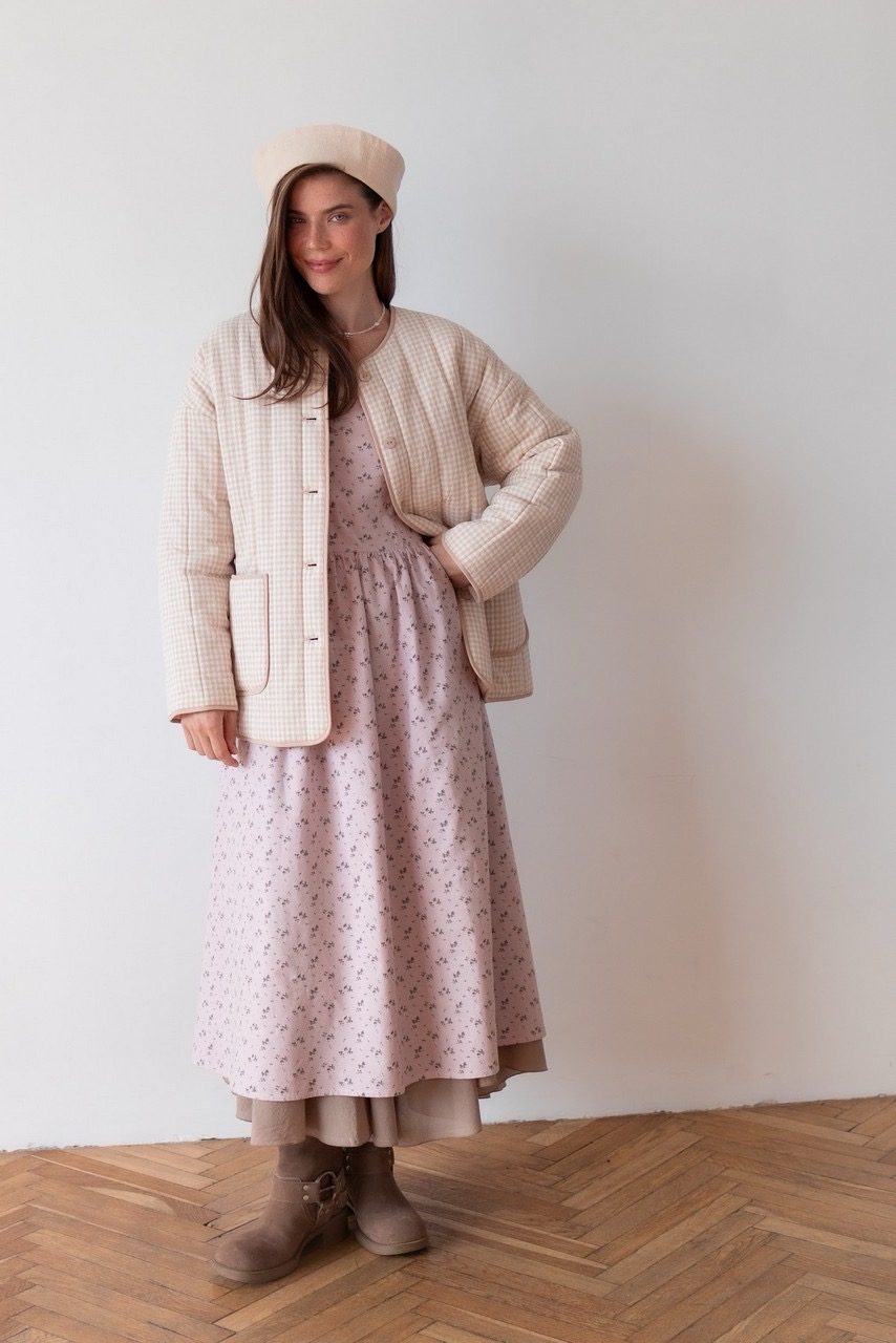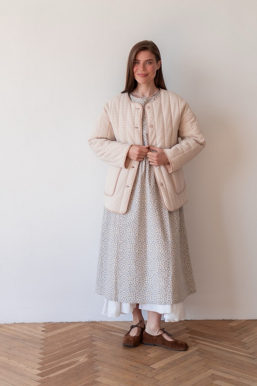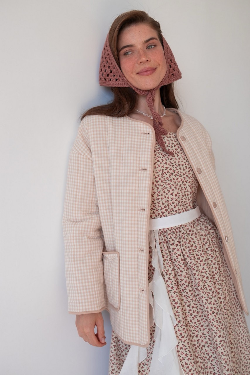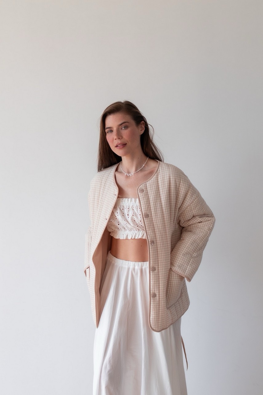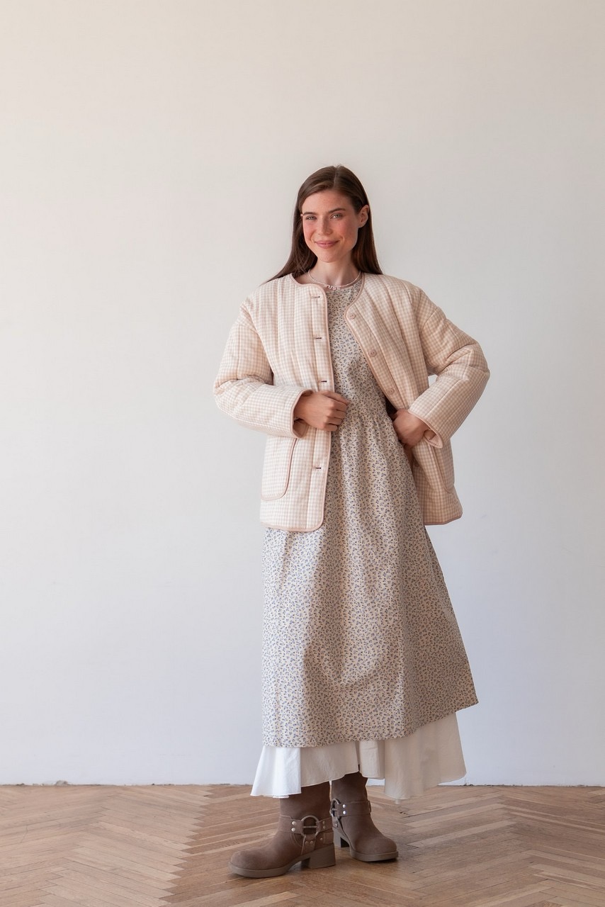 Стёганая телогрейка с накладными карманами - стильная, легкая и уютная. Выполнена из приятного к телу натурального хлопка. Воздушный утеплитель 150 гр. согреет вас осенью, весной и прохладным летом. А изящная декоративная шнуровка на спинке - наша любимая деталь в телогрейке, сделает образ особенным, подчеркнет вашу индивидуальность, романтичность и творческую натуру.