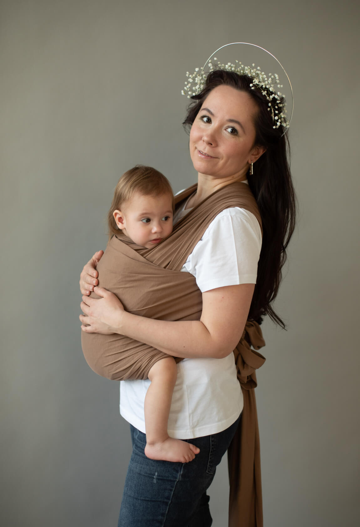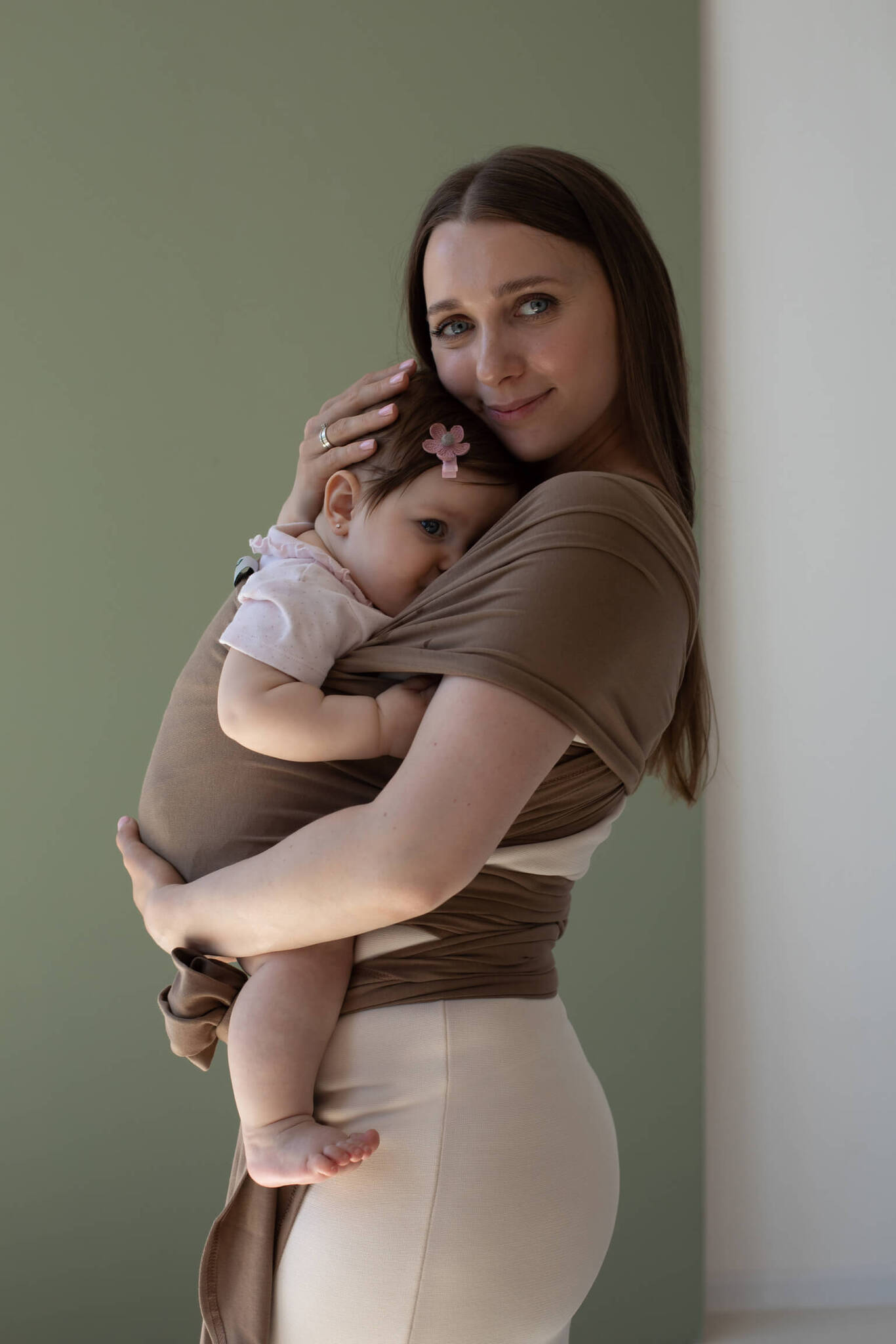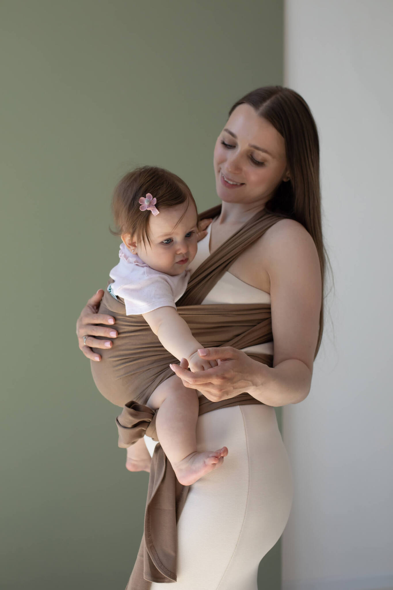 Мы можем намотать слинг один раз и уже в готовую намотку помещаем малыша. Далее можно вынимать/помещать малыша обратно в слинг несколько раз при этом сам слинг не перематывая.